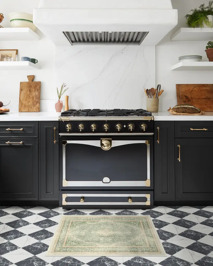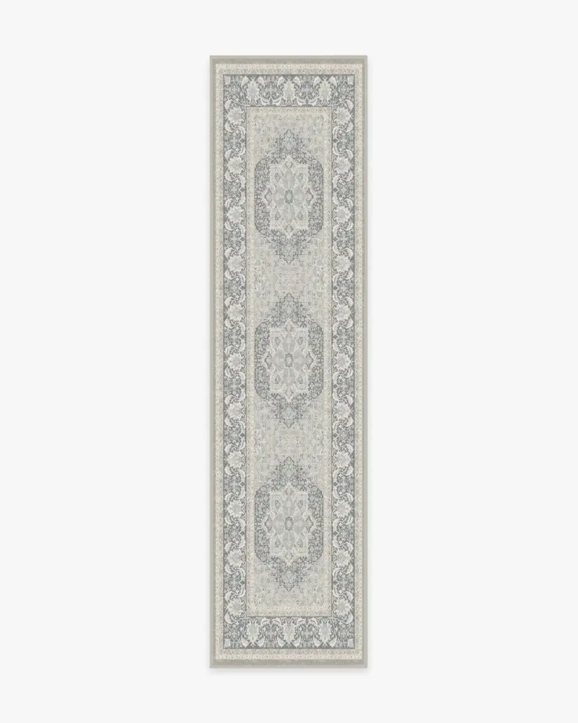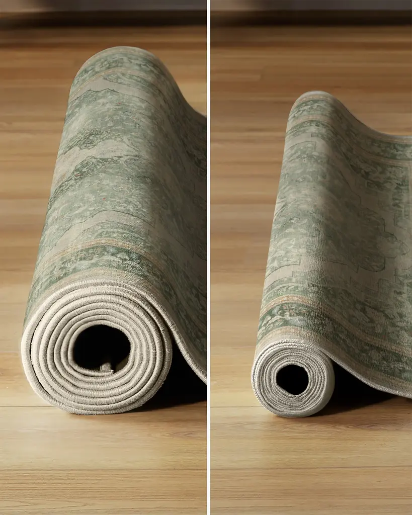 Inspired by classic European rug patterns, our Adeline Natural Sage Rug features a gently distressed diamond medallion with ornate corners and borders in shades of sage green, terracotta, gold, teal, and cream.