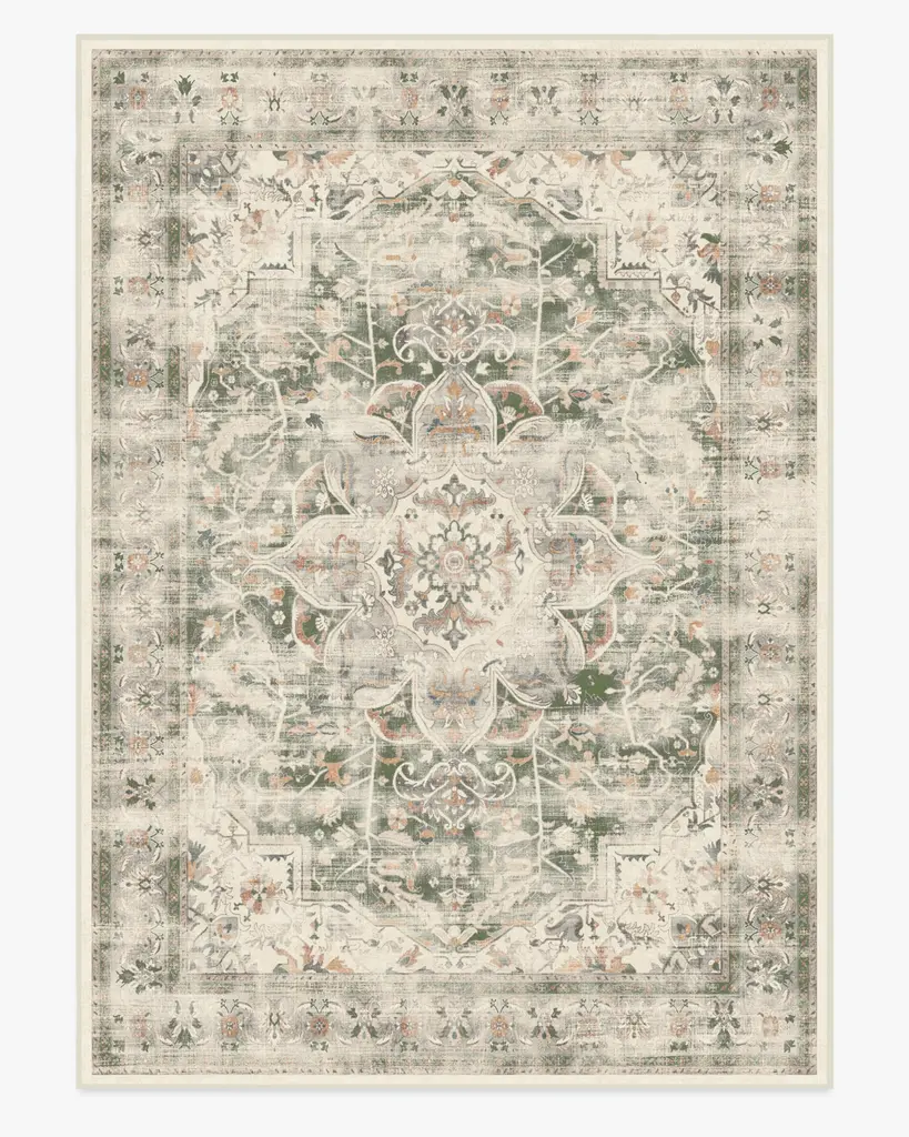 Inspired by classic European rug patterns, our Adeline Natural Sage Rug features a gently distressed diamond medallion with ornate corners and borders in shades of sage green, terracotta, gold, teal, and cream.