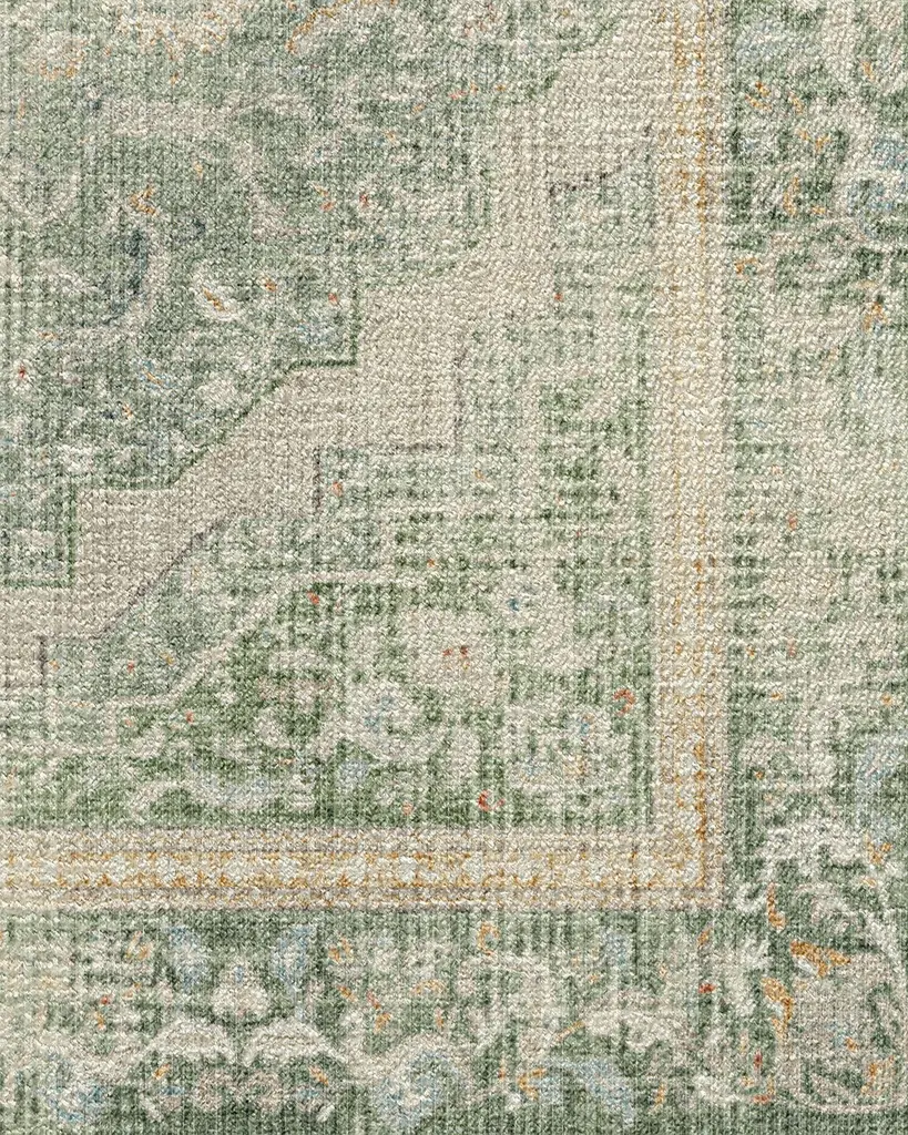 Inspired by classic European rug patterns, our Adeline Natural Sage Rug features a gently distressed diamond medallion with ornate corners and borders in shades of sage green, terracotta, gold, teal, and cream.