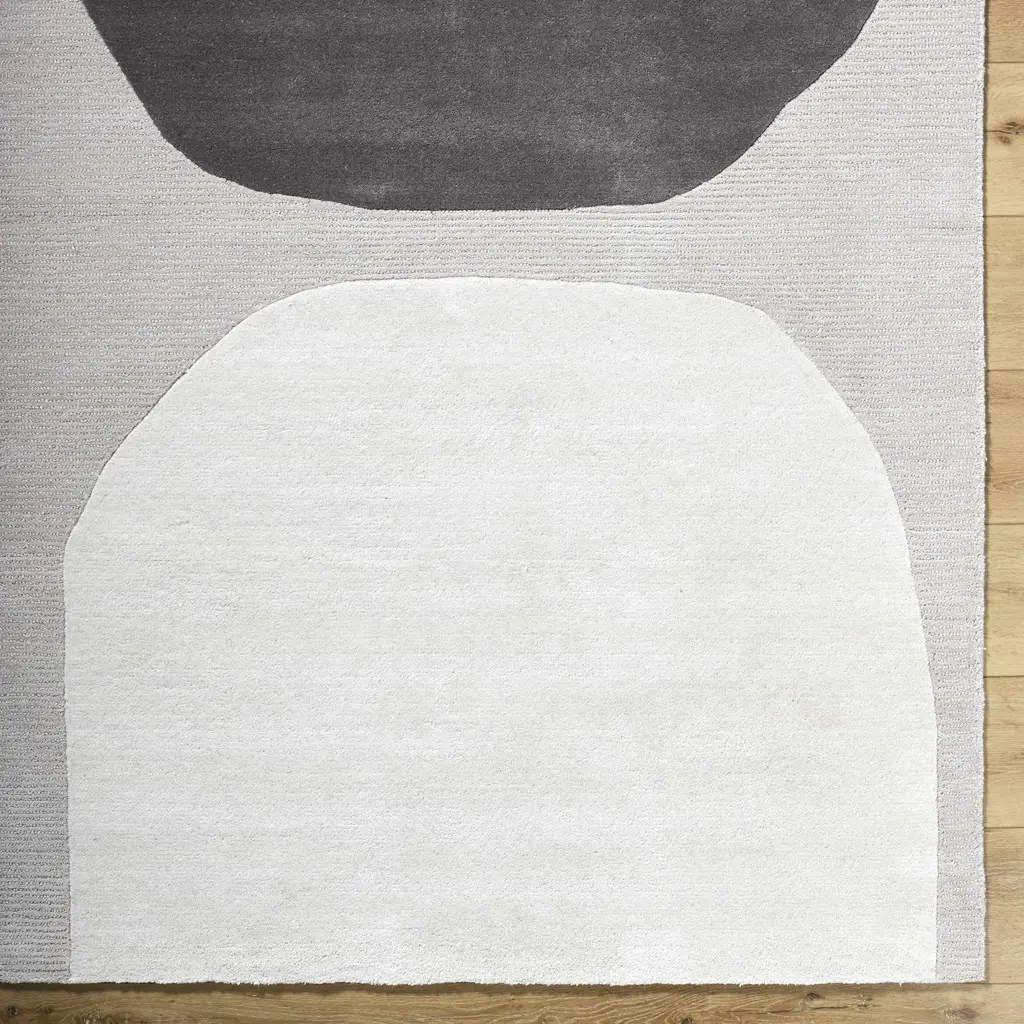 Collection: Adhara Colors: Sterling Gray, Medium Gray, Dark Purple Construction: Hand Tufted Material: 100% Wool Pile: Medium Pile Pile Height: 0.32" Styles: Contemporary Backing: Canvas Made In: India Thickness: 0.52" Price Range: $$$$$ (Affordable)