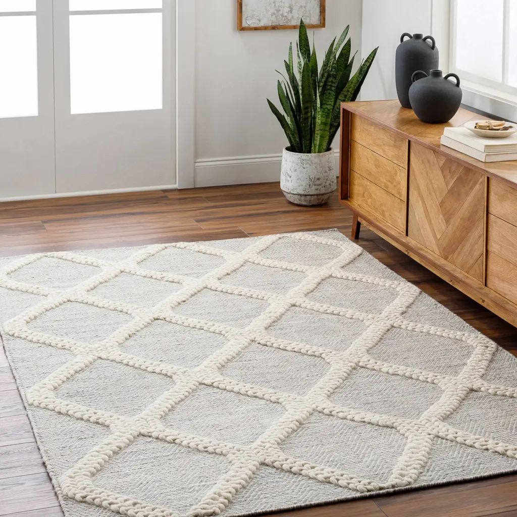 Collection: Adora Colors: Ivory, Taupe Construction: Hand Woven Material: 30% Wool,70% RecycledPETYarn Pile: Medium Pile Pile Height: 0.25" Styles: Contemporary Made In: India Thickness: 0.5" Price Range: $$$$$ (Affordable)