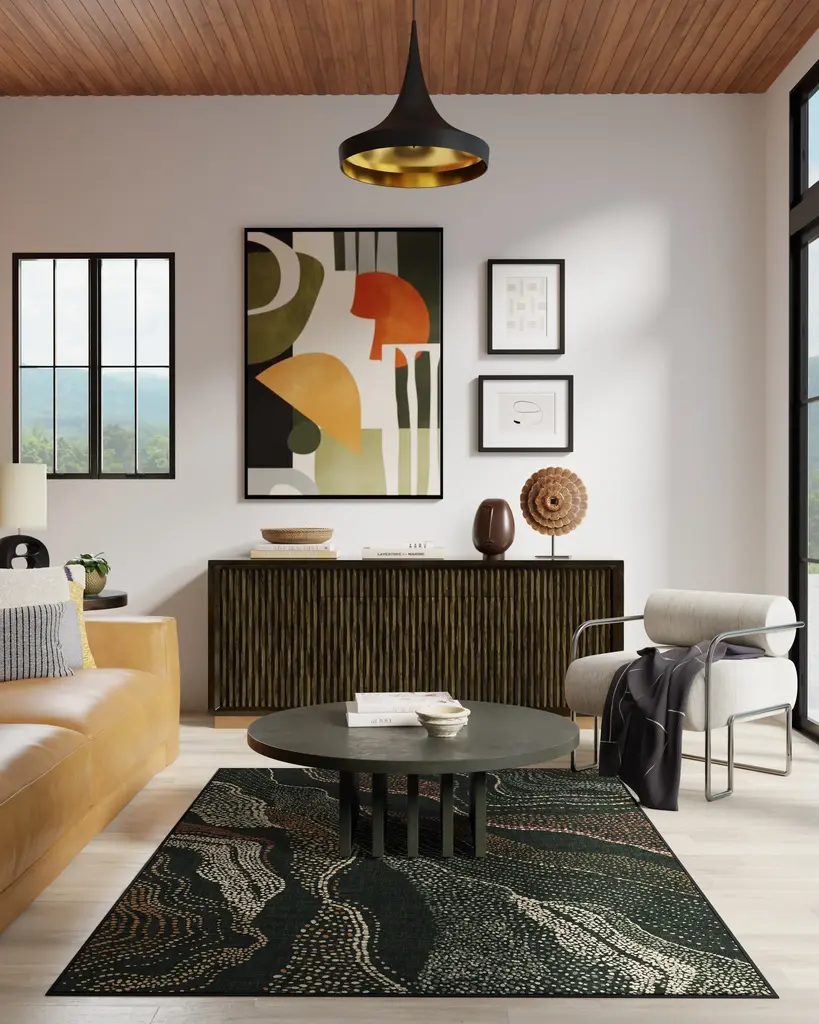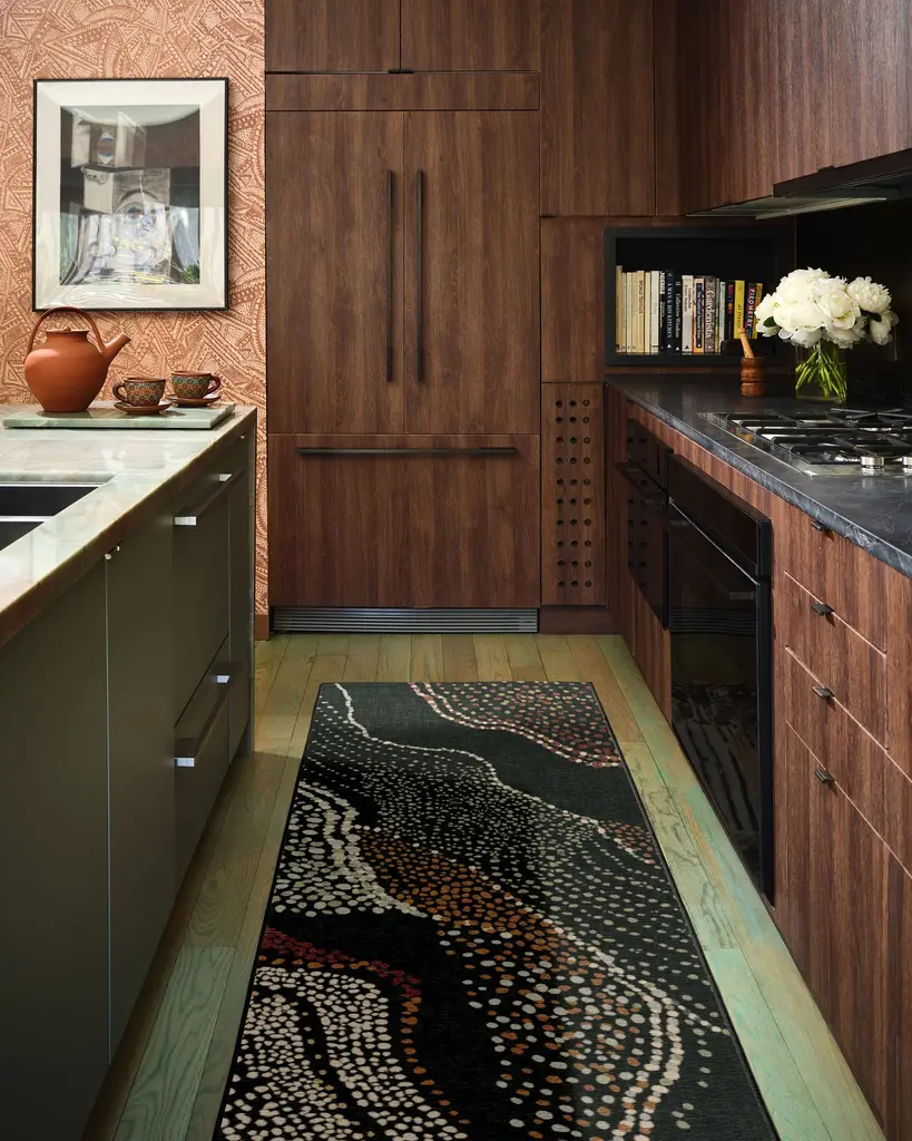 Step into a world of cultural richness and artistic expression with our Malene Barnett Adorned Black Multicolor Rug. Inspired by the intricate body art traditions of the Nuba people, this expressive design features a repeated textural dotted pattern arranged organically. Movement and visual interest are heightened through repetition of the rustic red, orange, gold, pastel green, sage green, and cream motifs. A striking black background solidifies the palette, creating a perfect tapestry of color and texture. Water-resistant, stain-resistant, and machine-washable. Rug colors may vary slightly according to your device and the lighting in your space.