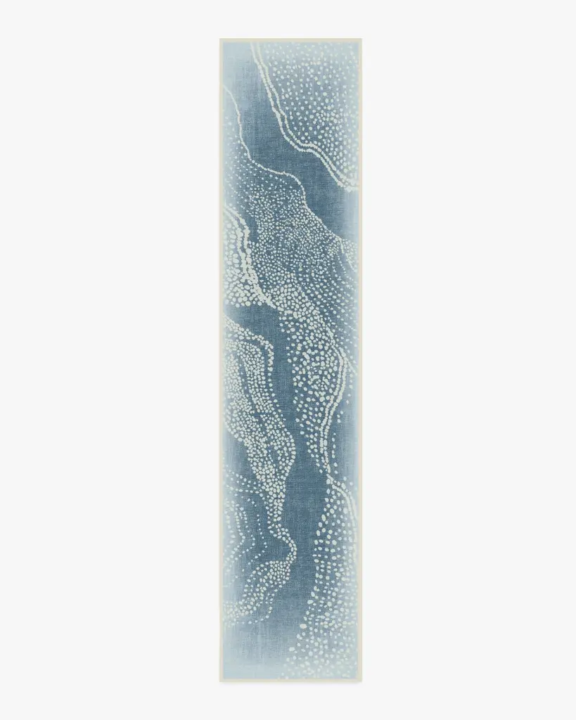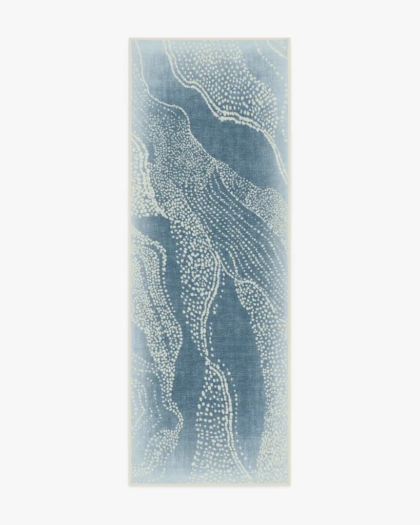 Step into a world of cultural richness and artistic expression with our Malene Barnett Adorned Soft Blue Rug. Inspired by the intricate body art traditions of the Nuba people, this expressive design features a repeated textural dotted pattern arranged organically, gradually transitioning into an ombre effect. Movement and visual interest are heightened through repetition of the light cream motifs against a soft blue gradient background. Water-resistant, stain-resistant, and machine-washable. Rug colors may vary slightly according to your device and the lighting in your space.