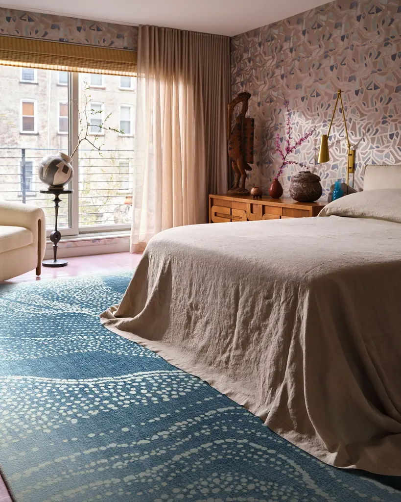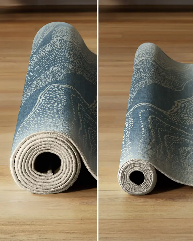 Step into a world of cultural richness and artistic expression with our Malene Barnett Adorned Soft Blue Rug. Inspired by the intricate body art traditions of the Nuba people, this expressive design features a repeated textural dotted pattern arranged organically, gradually transitioning into an ombre effect. Movement and visual interest are heightened through repetition of the light cream motifs against a soft blue gradient background. Water-resistant, stain-resistant, and machine-washable. Rug colors may vary slightly according to your device and the lighting in your space.