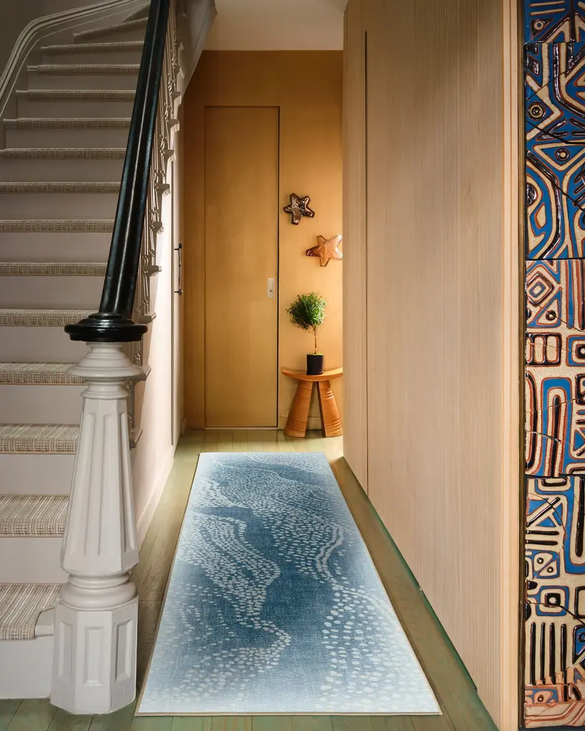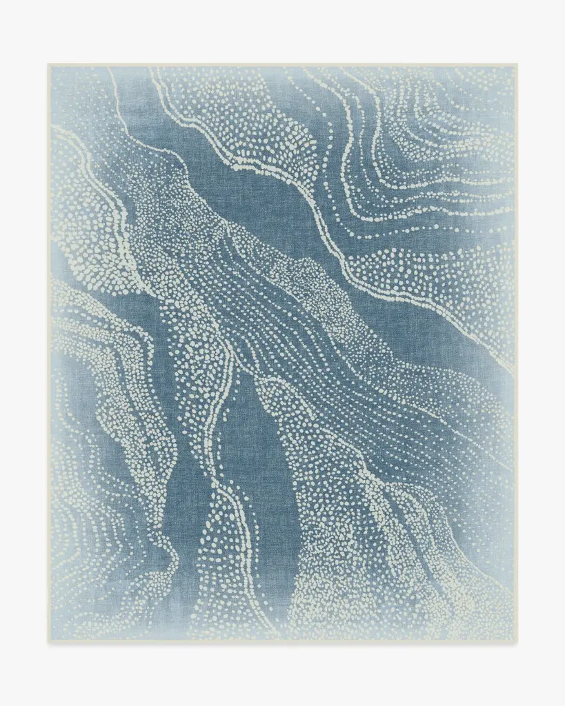 Step into a world of cultural richness and artistic expression with our Malene Barnett Adorned Soft Blue Rug. Inspired by the intricate body art traditions of the Nuba people, this expressive design features a repeated textural dotted pattern arranged organically, gradually transitioning into an ombre effect. Movement and visual interest are heightened through repetition of the light cream motifs against a soft blue gradient background. Water-resistant, stain-resistant, and machine-washable. Rug colors may vary slightly according to your device and the lighting in your space.