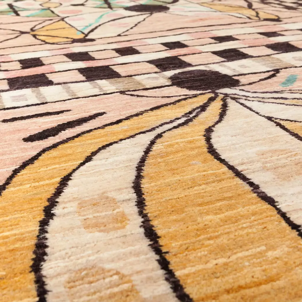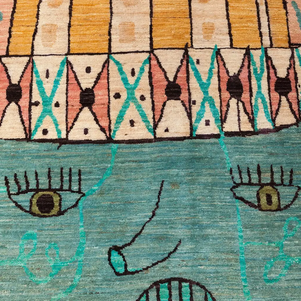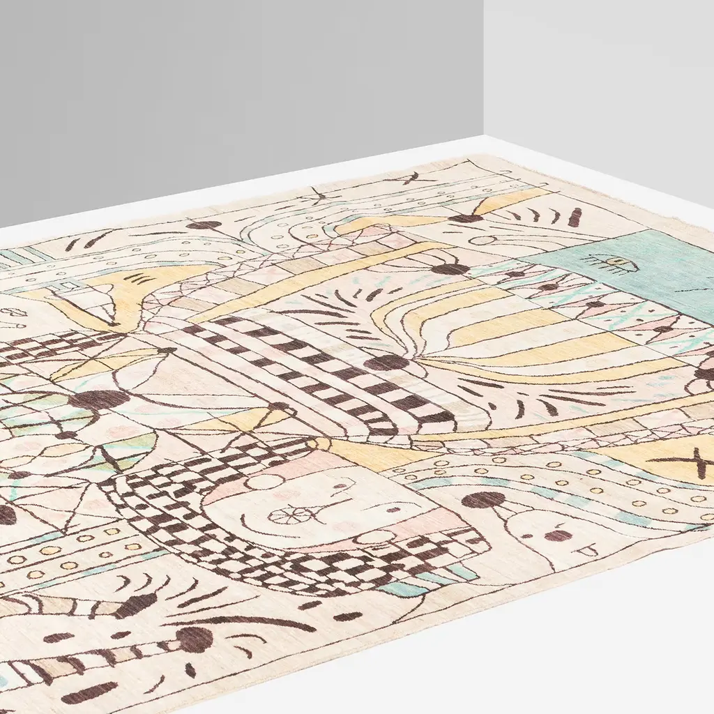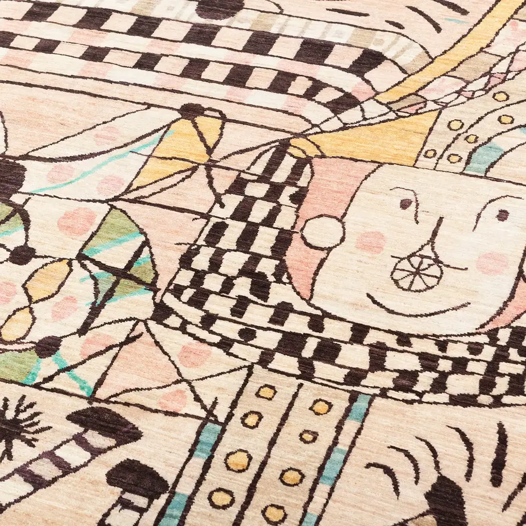 Set on a cream-colored background, this rug features a stunning abstract pattern that will make a perfect foundation for a contemporary interior. Designed by Jaime Hayon in 2015, this piece features a whimsical array of figures and animals rendered in a playful Paul Klee-inspired style. This limited-edition rug is hand-knotted by skillful weavers in Afghanistan using 100% wool and features 100 knots per inch with 5mm-high pile. It is available in other sizes upon request.