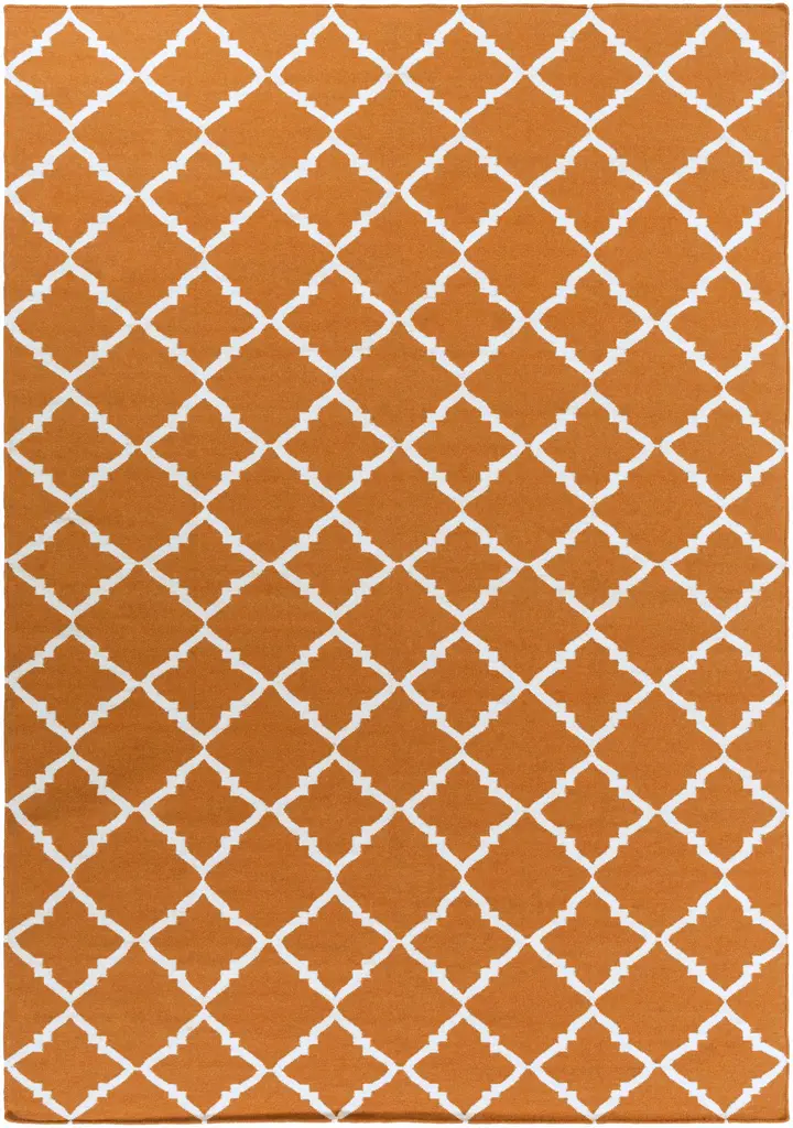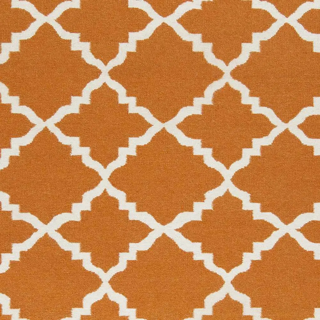 Collection: Aguilar Colors: Burnt Orange, Ivory Construction: Hand Woven Material: 100% Wool Pile: No Pile Styles: Transitional Made In: India Thickness: 0.16" Price Range: $$$$$ (Most Affordable)