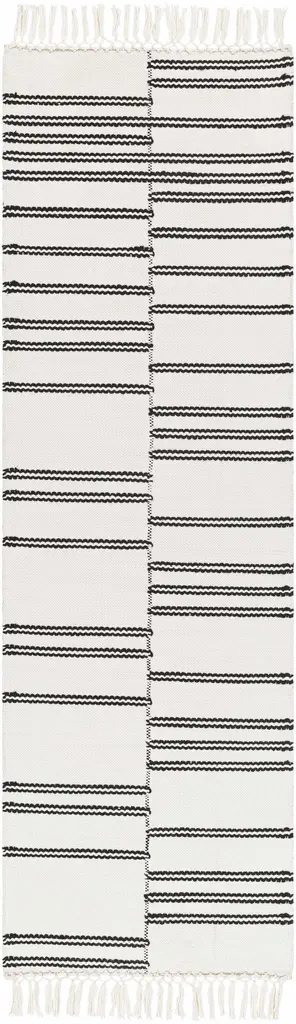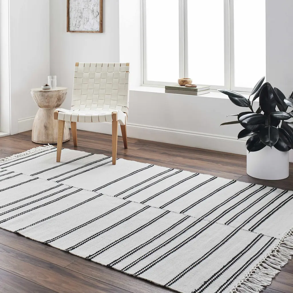 Collection: Akash Colors: Off White, Charcoal, Gray Construction: Hand Woven Material: 100% Recycled PET Yarn Pile: No Pile Styles: Transitional,Traditional Made In: India Thickness: 0.12" Fringe Length: 3.5" Price Range: $$$$$ (Most Affordable)