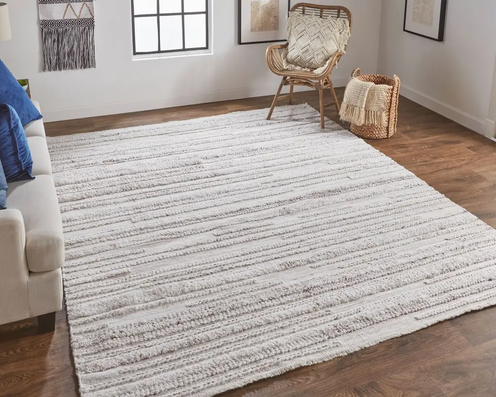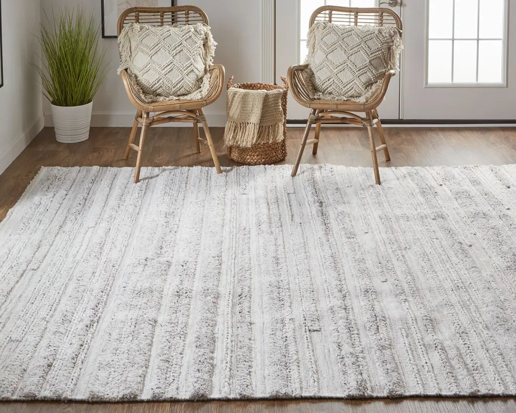 The handwoven Akton Collection comes in exclusive colors and is curated by interior and product designer, Thom Filicia. The varying hand knots bring a high-low profile to the area rug. In neutral colors of beige, grey, charcoal, and brown, the collection is relaxed and easy to care for. The braided appearance of the knots combined with fringe edged detail brings texture to any room.
