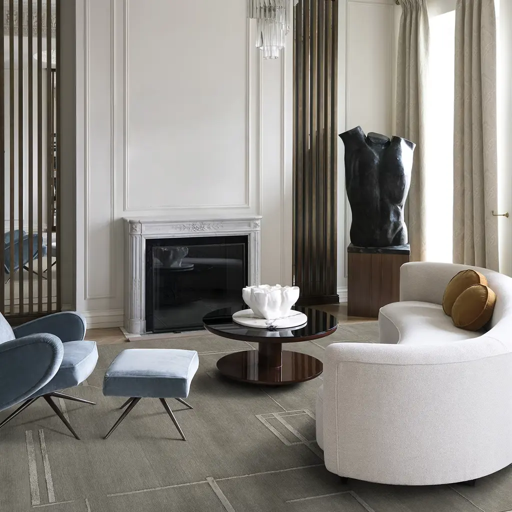 Distinguished by an exquisite and original warm gray tone, this spectacular carpet is hand-knotted from 60% wool and 40% silk, enriched with a minimalist geometric low relief pattern also fashioned of silk. A precious and iconic design piece, it is suitable for decorating both floors or walls in traditional and contemporary interiors, alike.