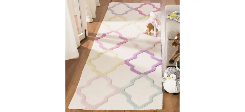 The Alanda Kid's Rug features a colorful design with geometric shapes for a fun addition to your kid's room. These rugs are made with pure soft wool and hand-tufted to a cotton backing for added cushion.