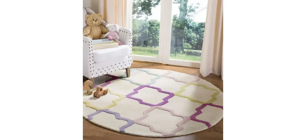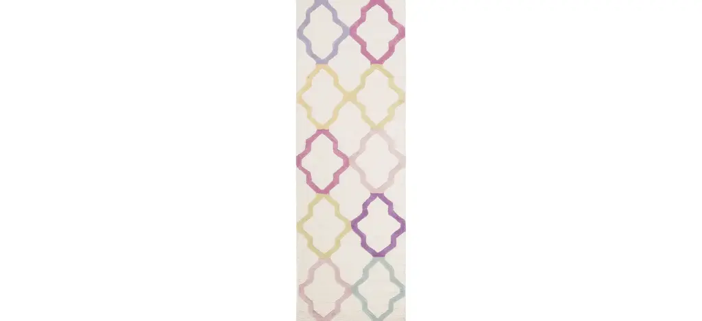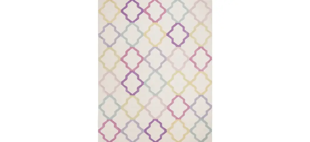 The Alanda Kid's Rug features a colorful design with geometric shapes for a fun addition to your kid's room. These rugs are made with pure soft wool and hand-tufted to a cotton backing for added cushion.