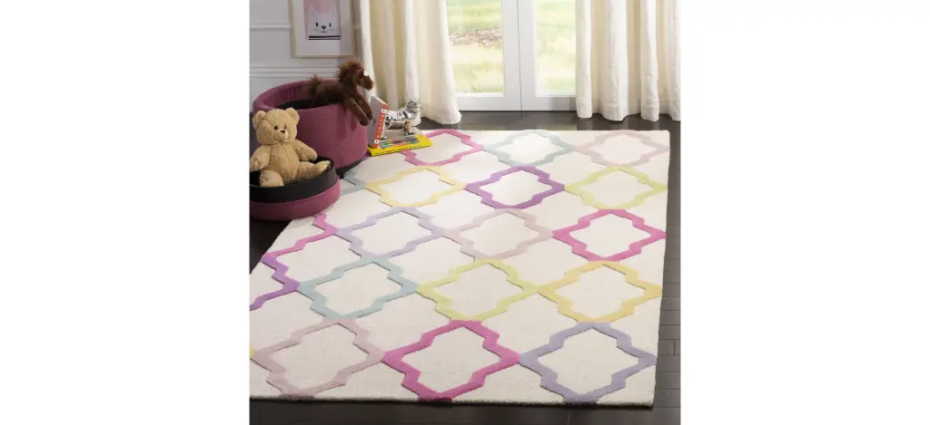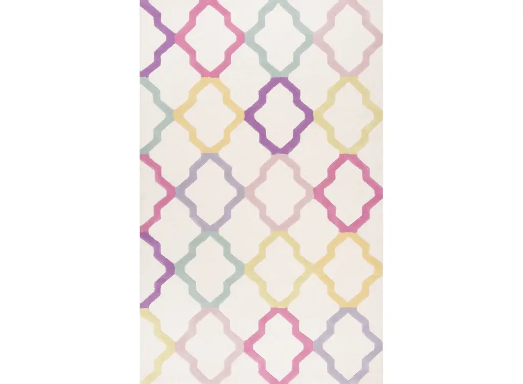 The Alanda Kid's Rug features a colorful design with geometric shapes for a fun addition to your kid's room. These rugs are made with pure soft wool and hand-tufted to a cotton backing for added cushion.