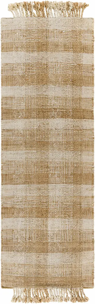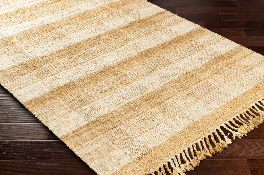 Collection: Alara Colors: Tan, LightBeige Construction: Hand Woven Material: 100% Jute Pile: No Pile Styles: Transitional,Traditional Made In: India Thickness: 0.5" Fringe Length: 3" Price Range: $$$$$ (Affordable)