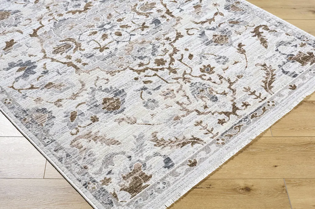 Collection: Aldona Colors: Ivory, Taupe, Slate Gray, Charcoal Construction: Machine Woven Material: 100% Polyester Pile: Medium Pile Pile Height: 0.24" Styles: Traditional Made In: Egypt Thickness: 0.39" Price Range: $$$$$ (Affordable)