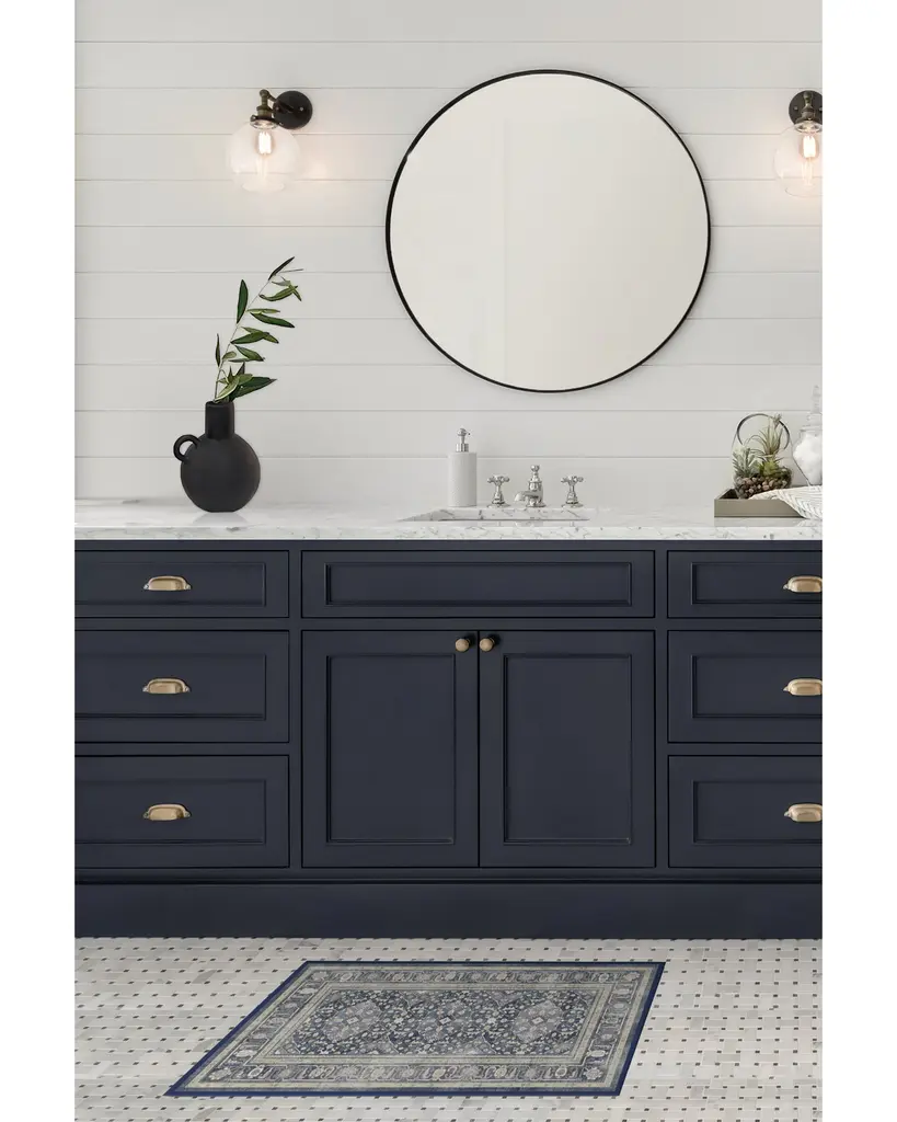 Blue and beautiful. This rug features checkerboarding coloration and a highly decorated border in slate blue with cream and subtle hints of coral. Water-resistant, stain-resistant, and machine-washable.