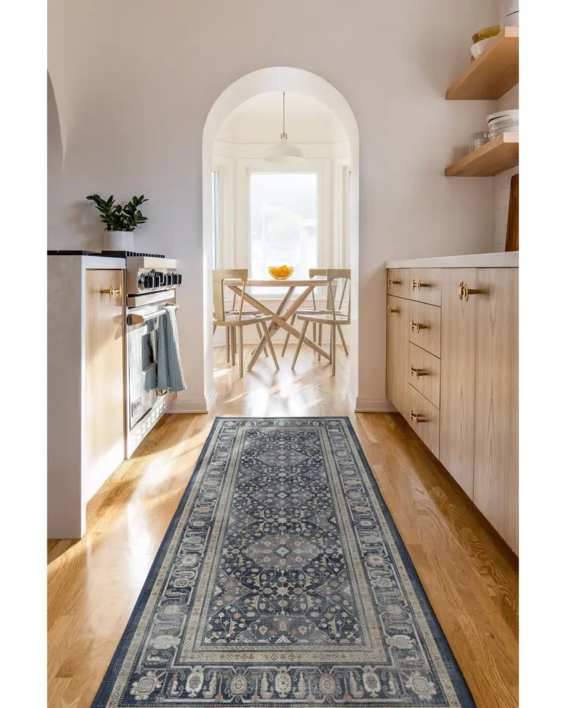Blue and beautiful. This rug features checkerboarding coloration and a highly decorated border in slate blue with cream and subtle hints of coral. Water-resistant, stain-resistant, and machine-washable.
