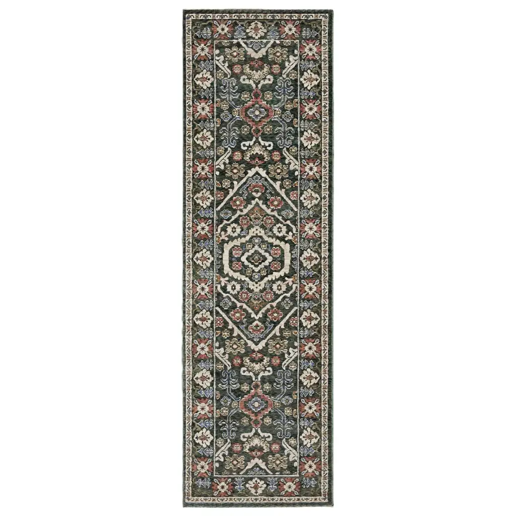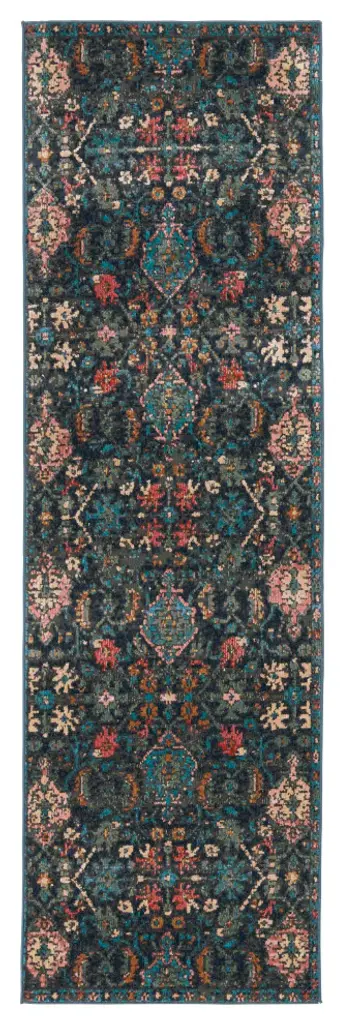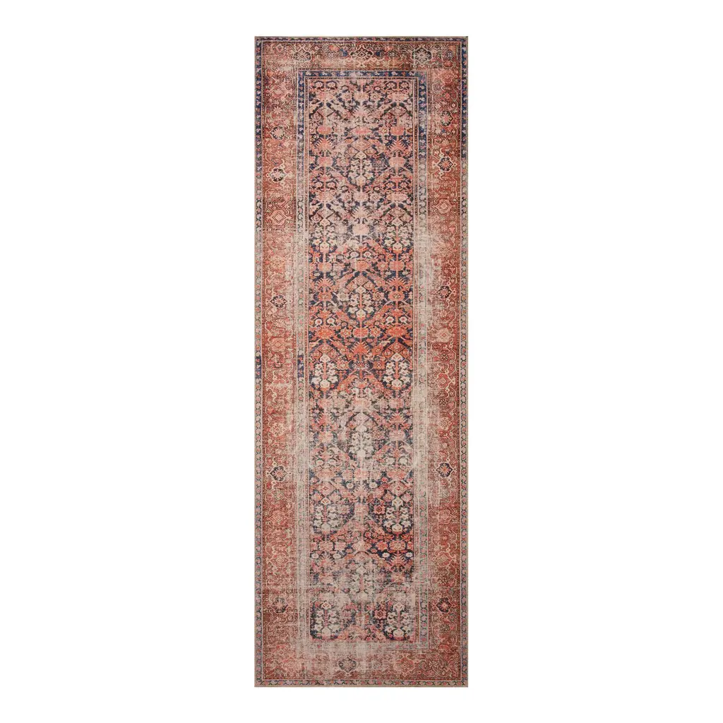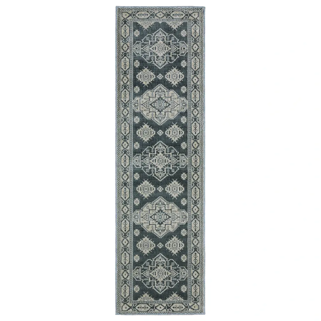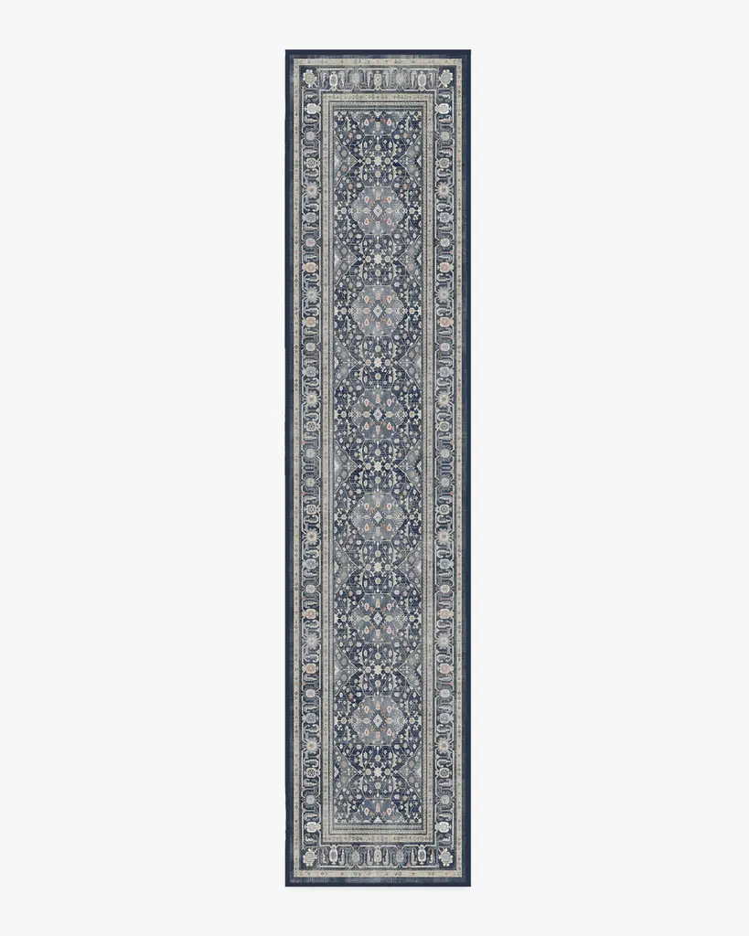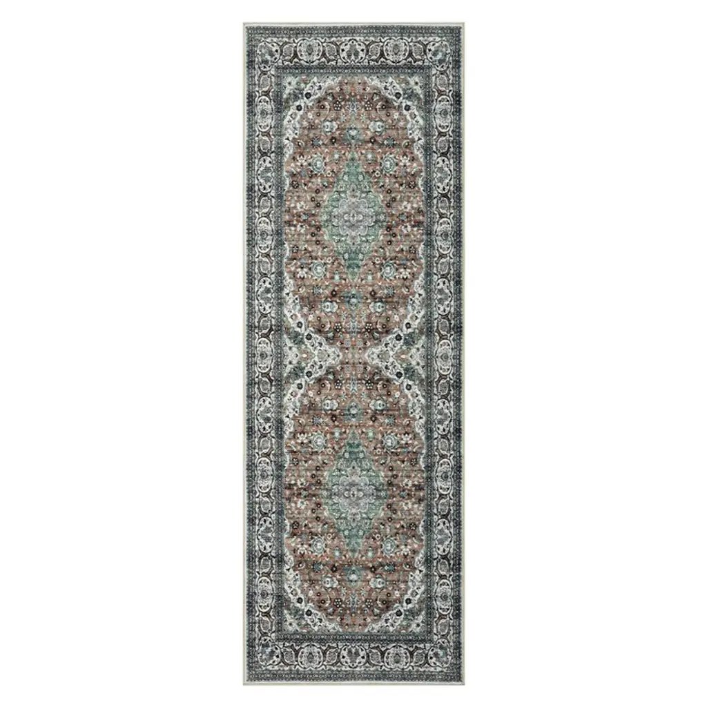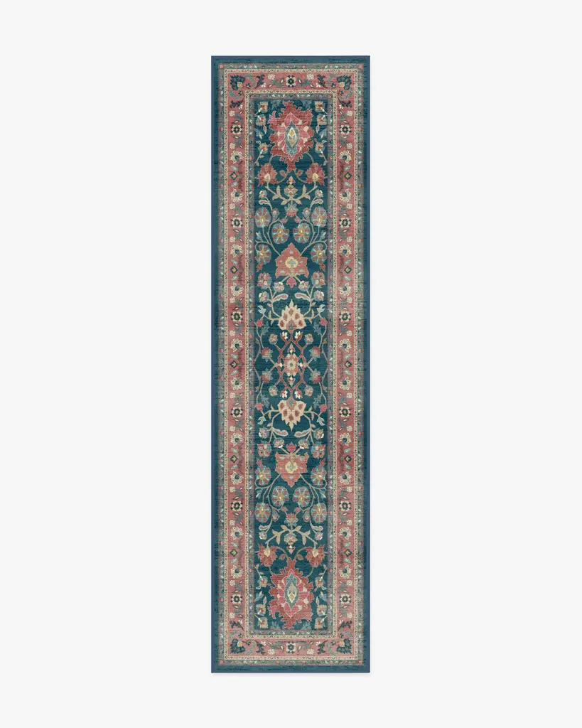 A statement-maker. The checkerboarding coloration and highly decorated border of this rug look striking in rich reds and deep blues with hints of gold. Water-resistant, stain-resistant, and machine-washable.