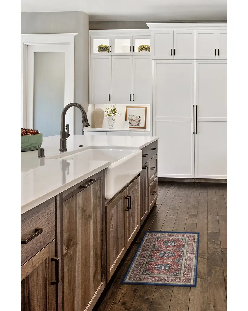 A statement-maker. The checkerboarding coloration and highly decorated border of this rug look striking in rich reds and deep blues with hints of gold. Water-resistant, stain-resistant, and machine-washable.