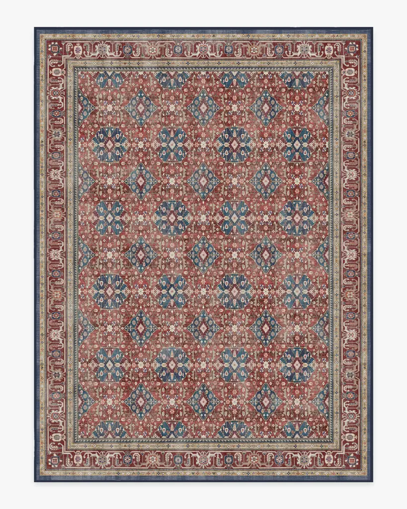 A statement-maker. The checkerboarding coloration and highly decorated border of this rug look striking in rich reds and deep blues with hints of gold. Water-resistant, stain-resistant, and machine-washable.