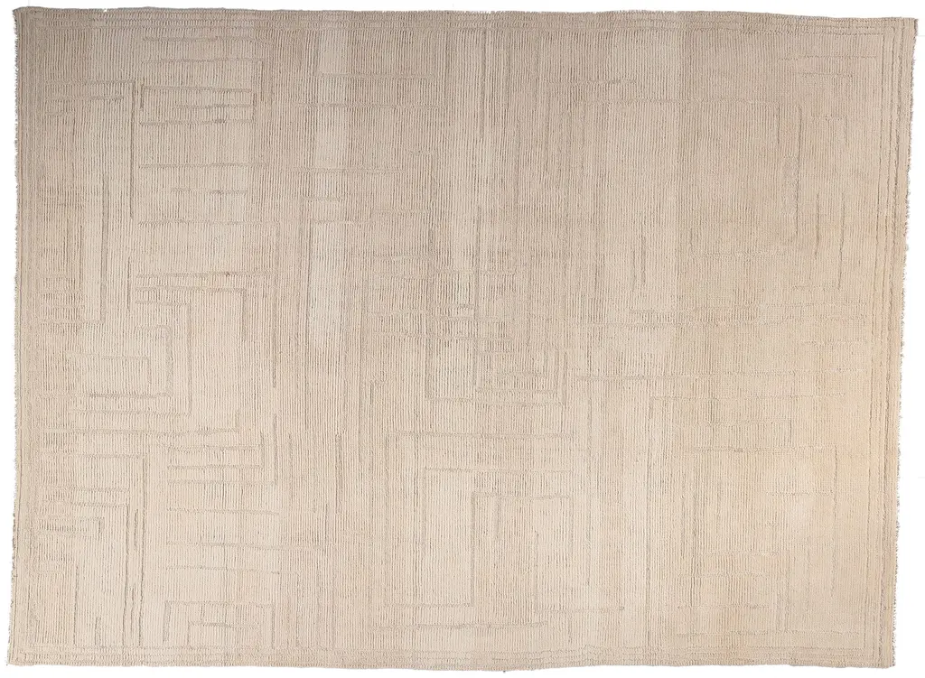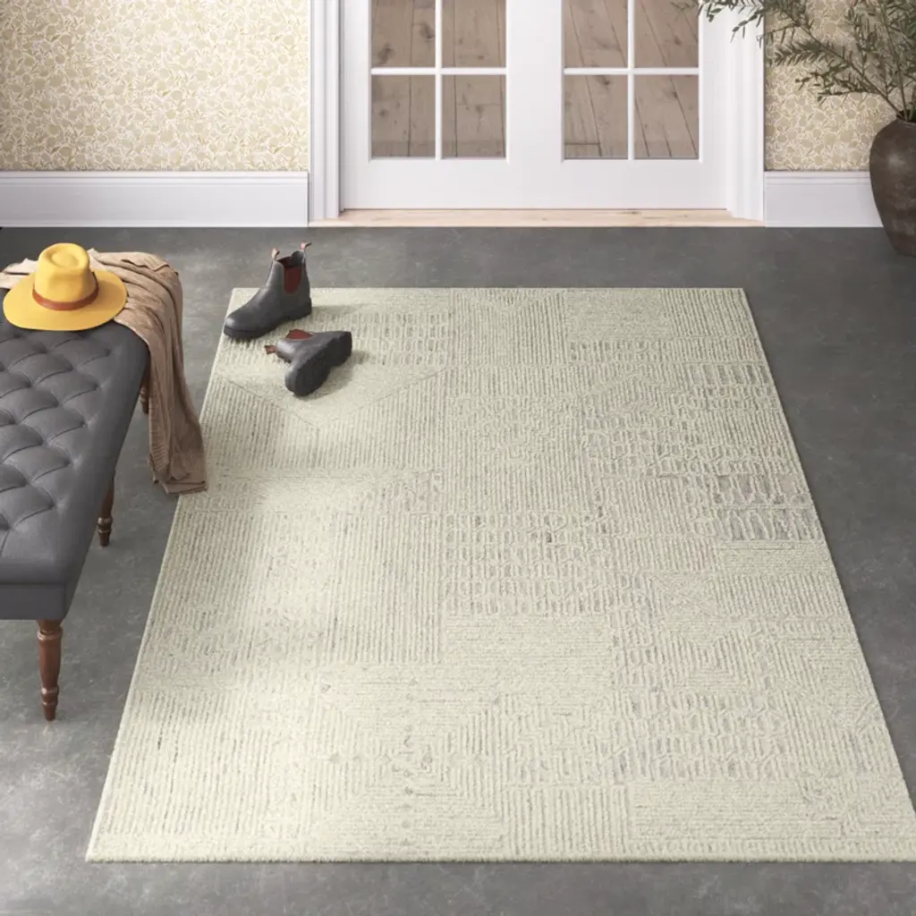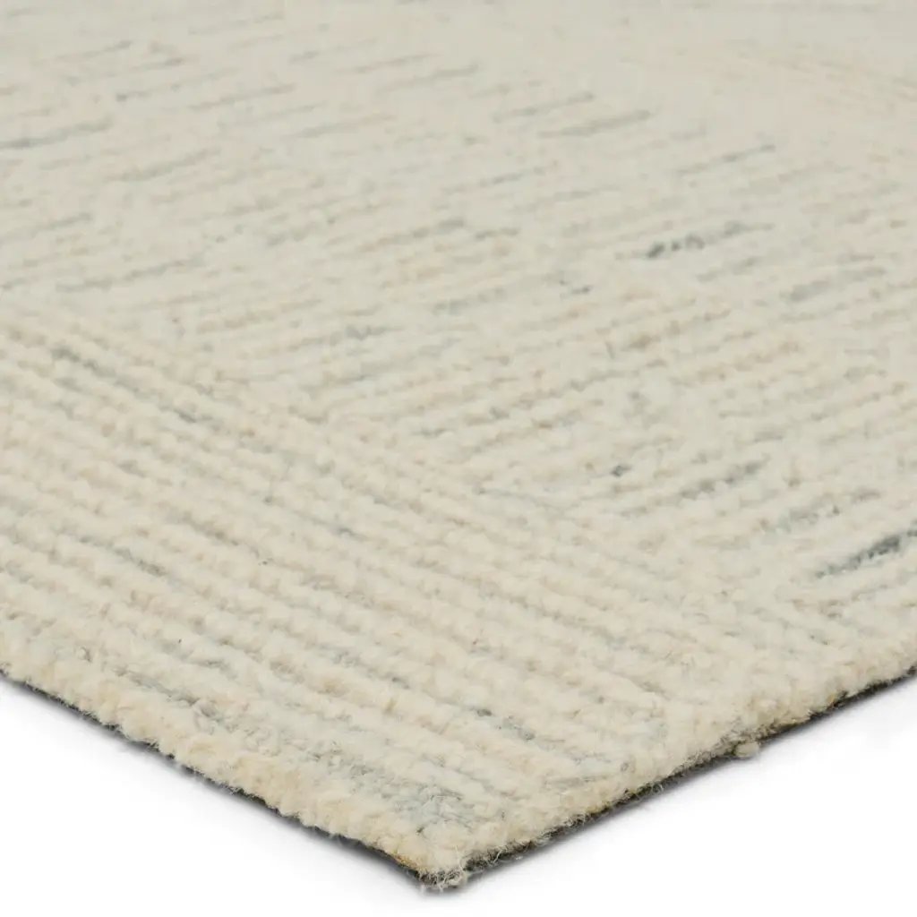 This hand-tufted area rug combines intricate, African, and Moroccan designs with a modern color palate. The cream and light gray looped pile creates a striped and geometric design of varying heights. The wool pile creates texture and dimension that delights in medium and low trafficked spaces of the home such as bedrooms, formal living rooms, dining spaces, and sitting rooms.
