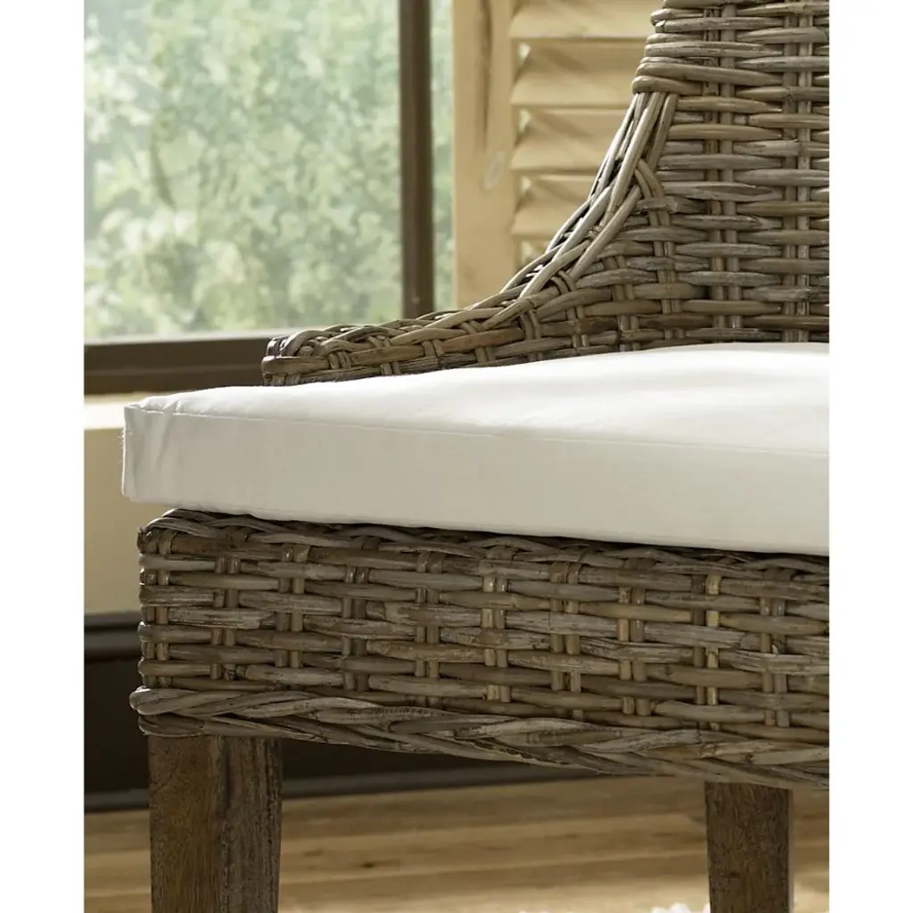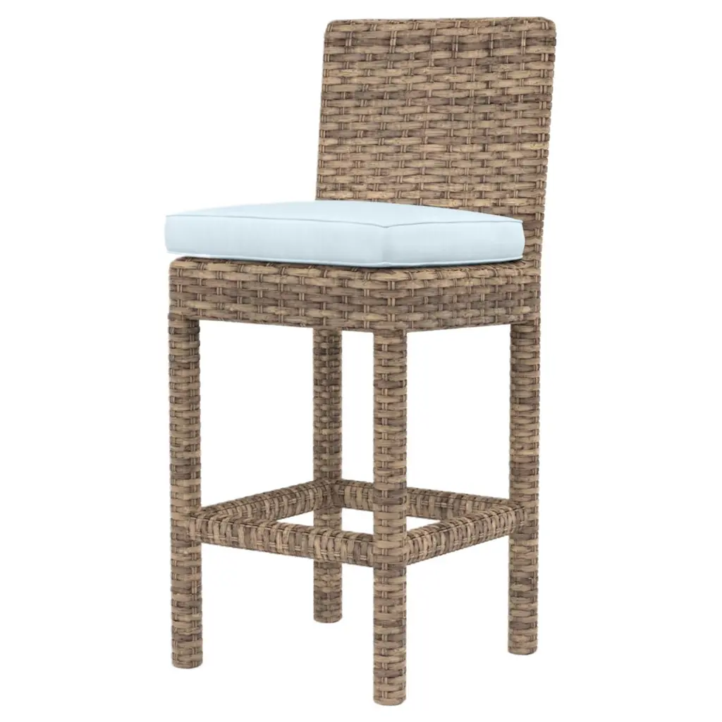 This curved-back woven rattan counter stool with seat cushion offers relaxed comfort as well as style versatility and a welcomed touch of earthy texture.