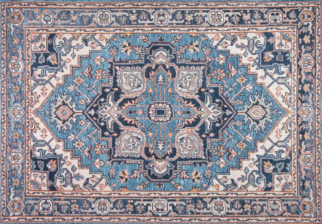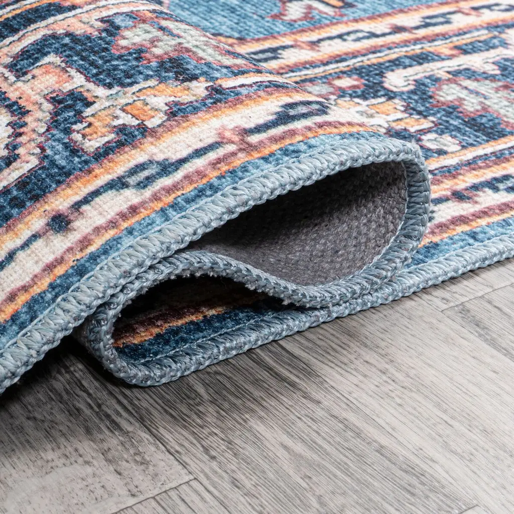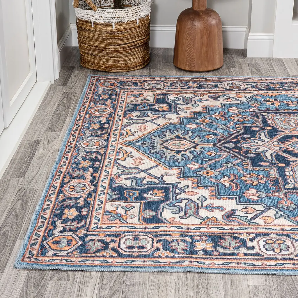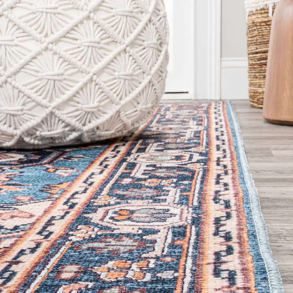 Antique Persian floor coverings inspired this rug's ornate design. Unlike those rugs, however, this durable polypropylene version is machine washable for maximum convenience. A rug pad is recommended to help prevent slipping.
