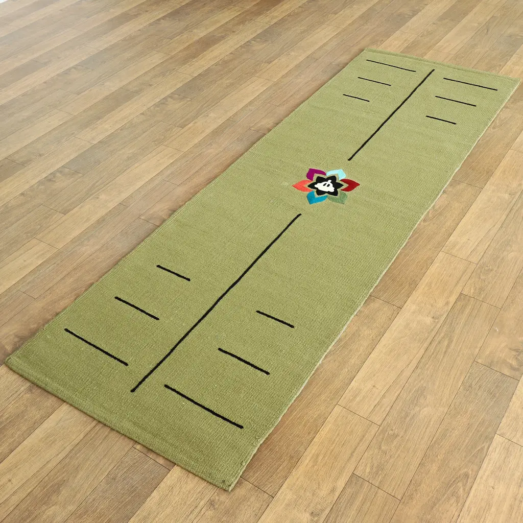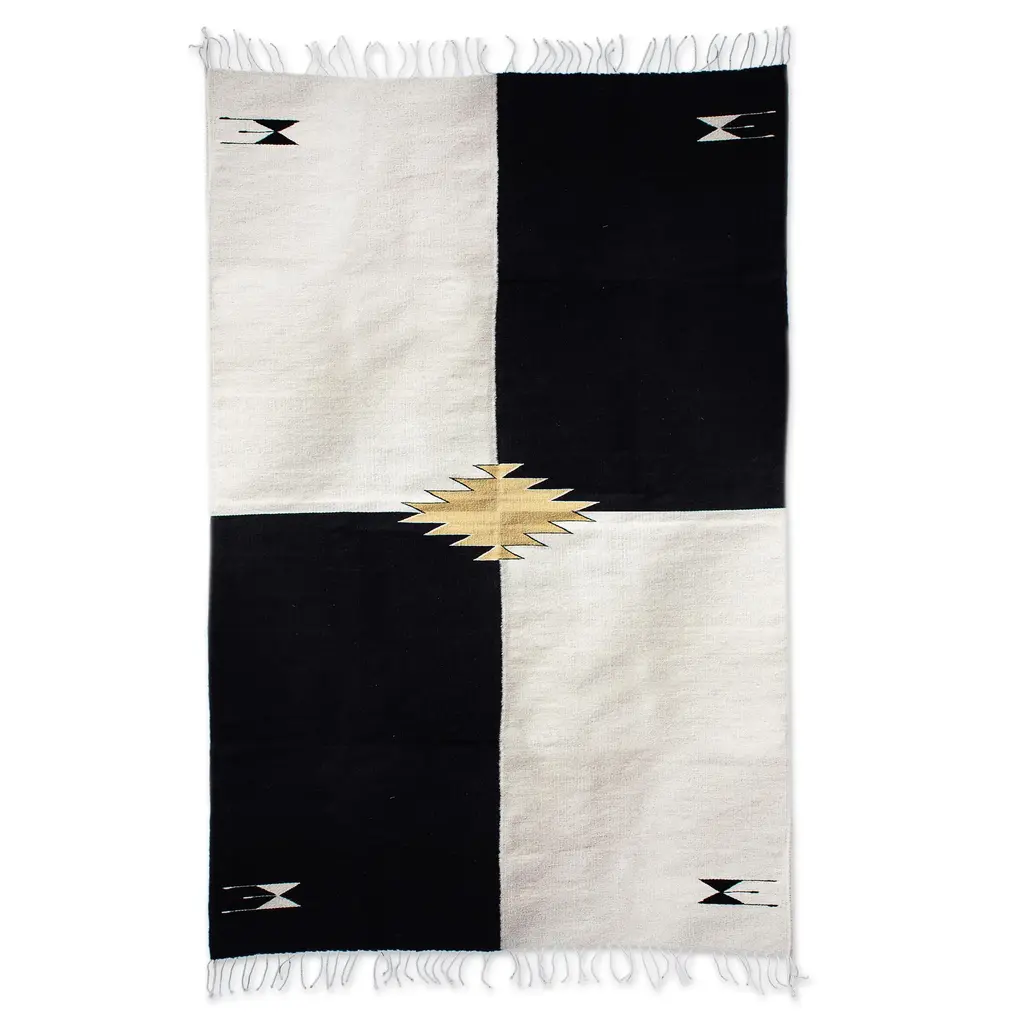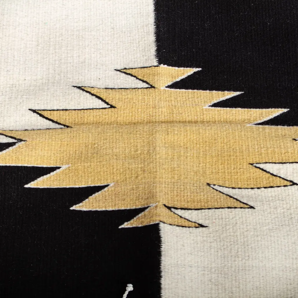 This dramatic all-wool area rug is the creation of Mario Chavez in Mexico. Hand woven on a traditional pedal loom, the rug features a colorblock design in black and white, with a central accent of straw yellow. Hand-knotted fringe accents both ends.