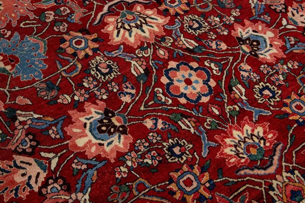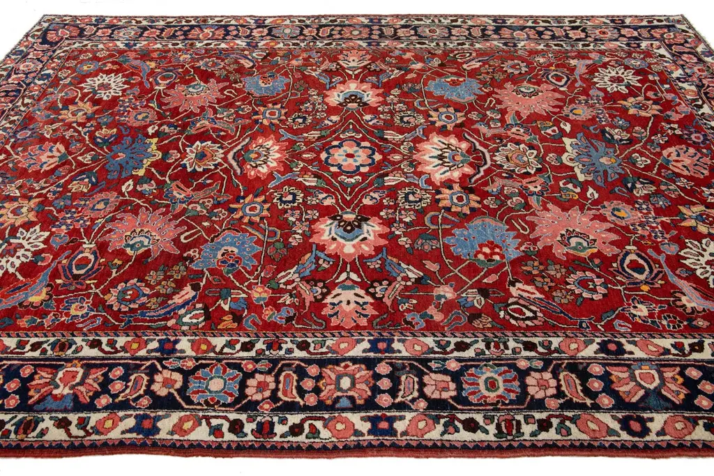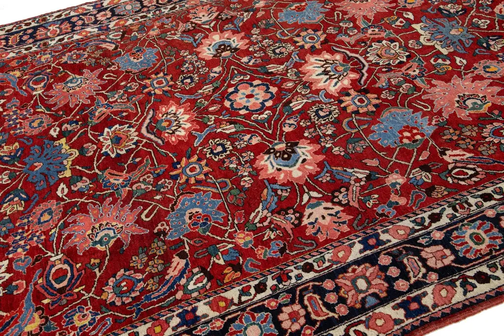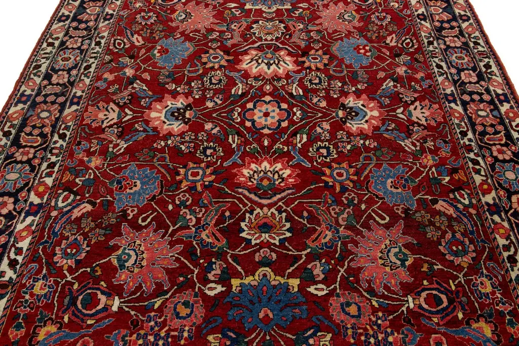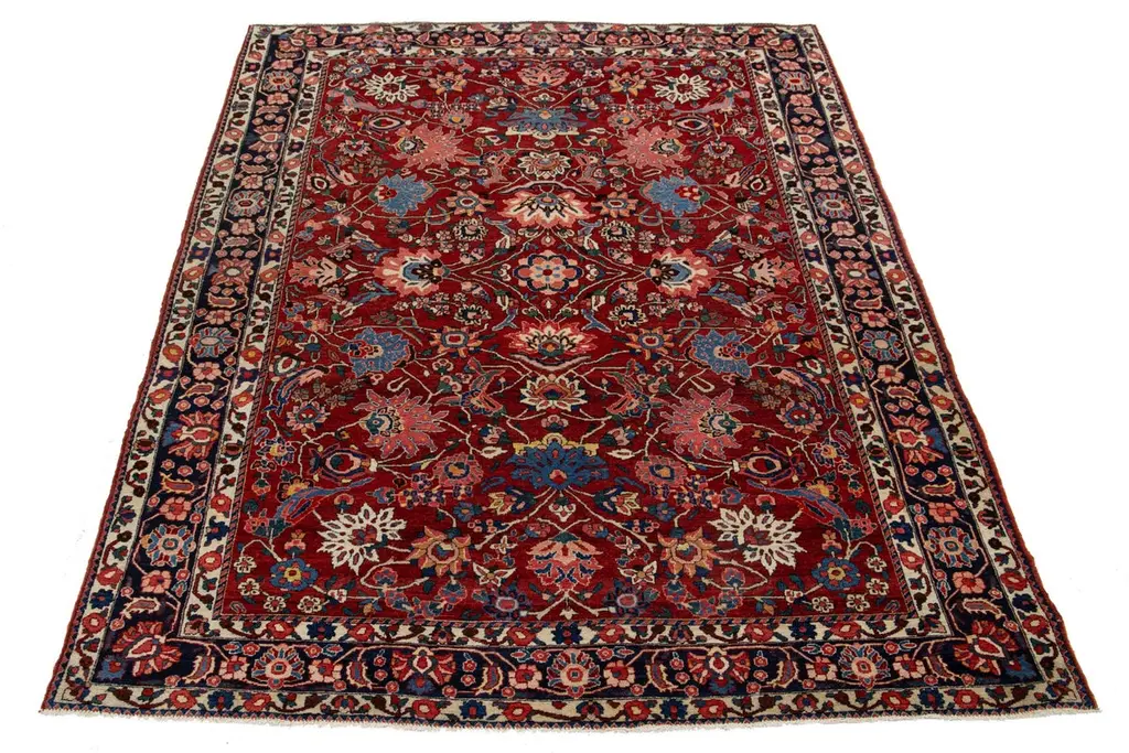 This is a beautiful, hand-knotted Antique Mahal wool rug with a red field. This Persian rug features a floral motif adorned with blue, pink, and green hues.This rug measures 6'10'' x 10'.