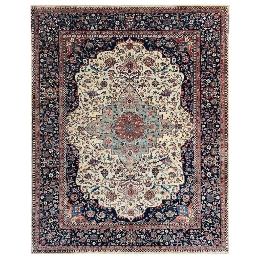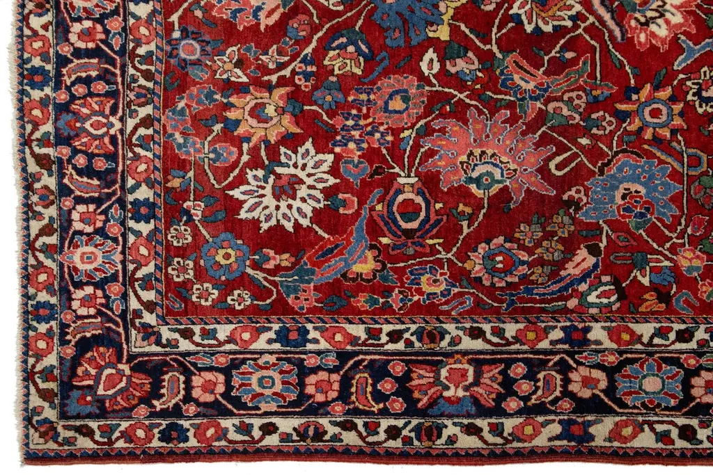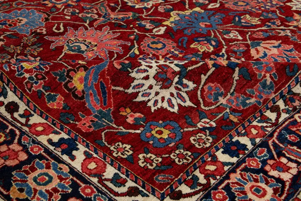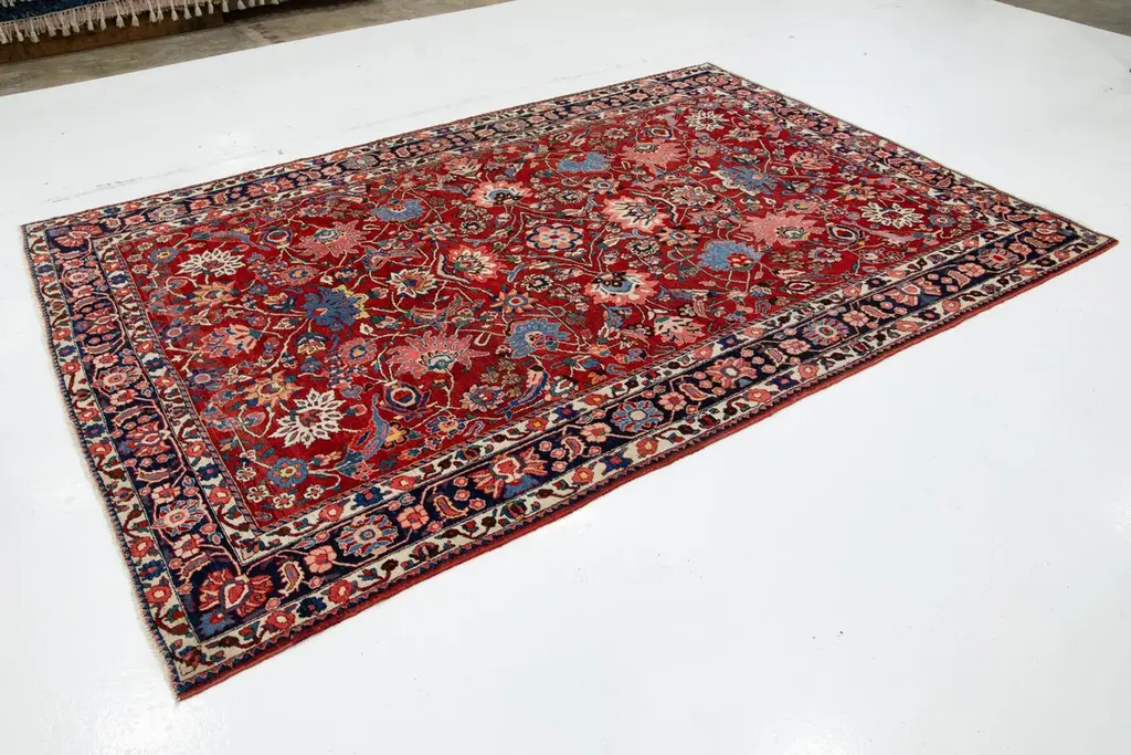 This is a beautiful, hand-knotted Antique Mahal wool rug with a red field. This Persian rug features a floral motif adorned with blue, pink, and green hues.This rug measures 6'10'' x 10'.