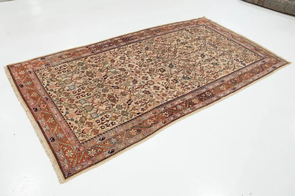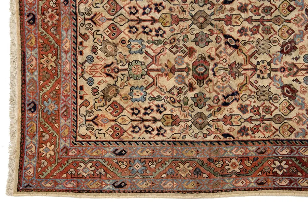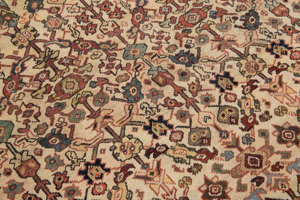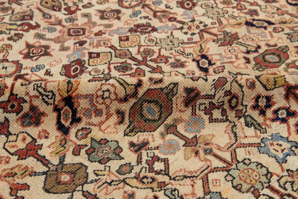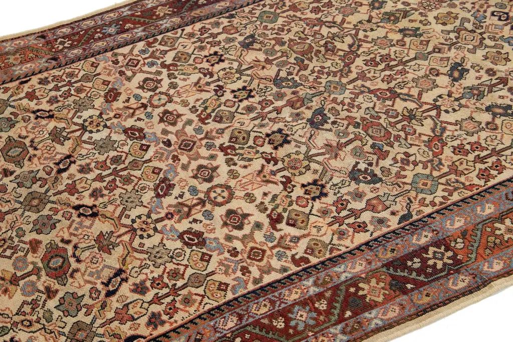 This unique, hand-knotted, oversized Antique Mahal wool rug features a beige field. It is a Persian rug with a floral pattern in blue, yellow, red, and green hues.This rug measures 5' x 8'5".