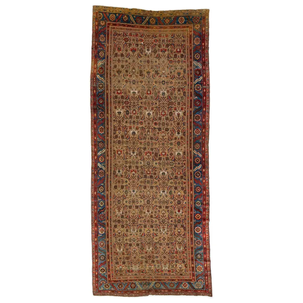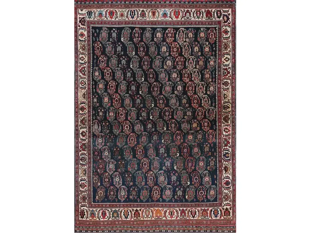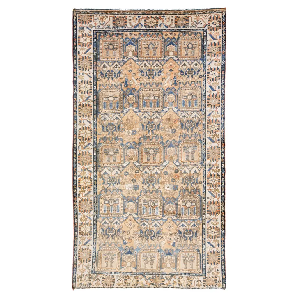 This unique, hand-knotted, oversized Antique Mahal wool rug features a beige field. It is a Persian rug with a floral pattern in blue, yellow, red, and green hues.This rug measures 5' x 8'5".