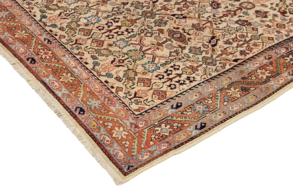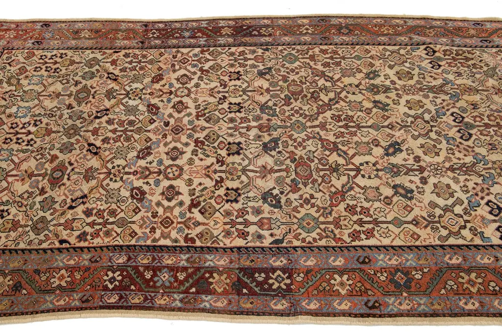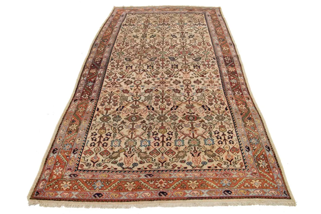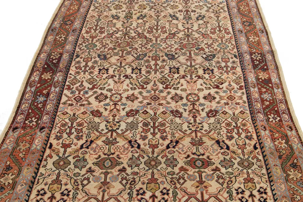 Allover Floral Designed Handmade Mahal Wool Rug In Beige From The 1920s