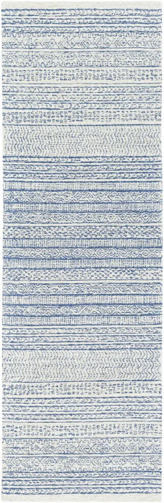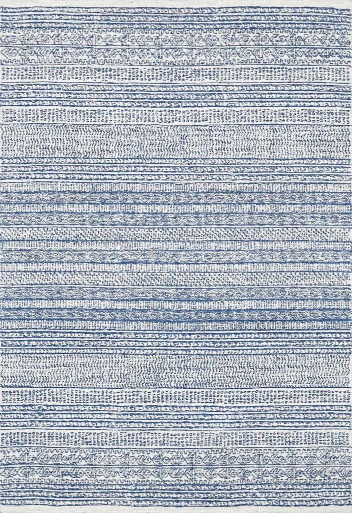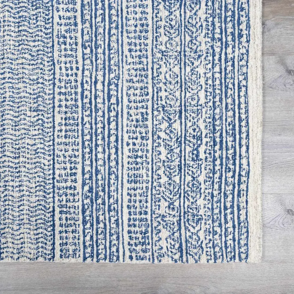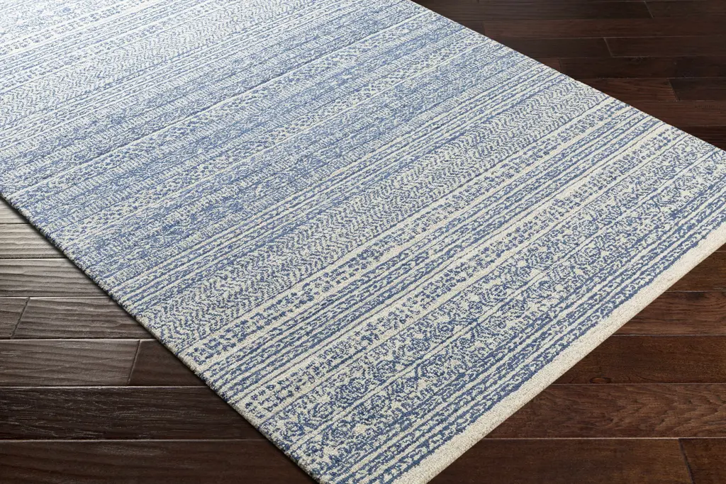 Collection: Allport Colors: Medium Gray, Navy, Light Gray, Beige Construction: Hand Tufted Material: 100% Wool Pile: Low Pile Pile Height: 0.19" Styles: Transitional,Bohemian Backing: Canvas Made In: India Thickness: 0.39" Price Range: $$$$$ (Affordable)
