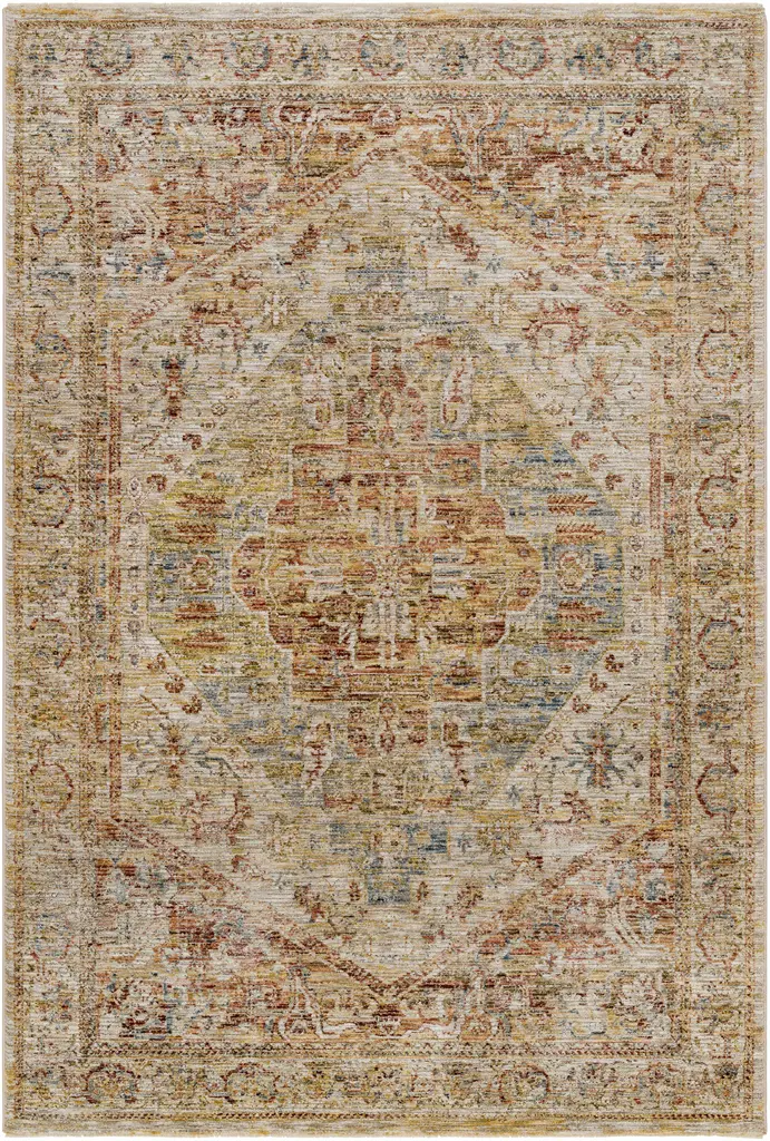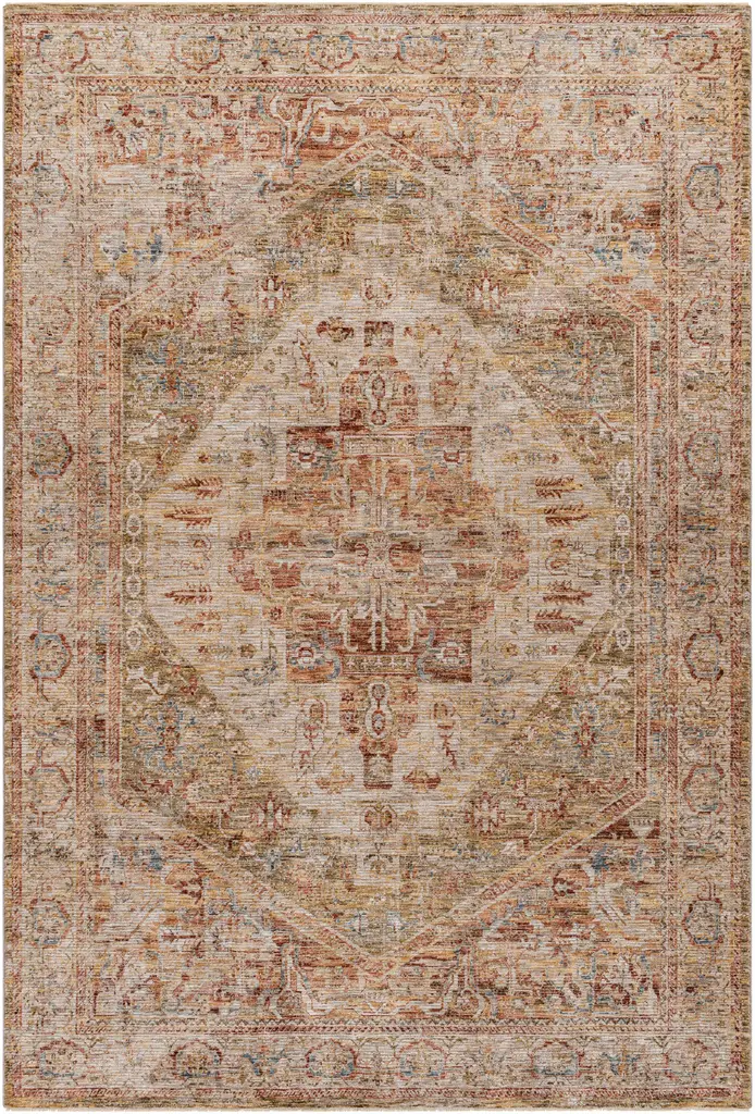 Collection: Alois Colors: Tan, Sage, Mustard, Olive, Rust, Light Sage Construction: Machine Woven Material: 100% Polyester Pile: Medium Pile Pile Height: 0.31" Styles: Traditional Made In: Turkey Thickness: 0.35" Fringe Length: 0.4" Price Range: $$$$$ (Affordable)