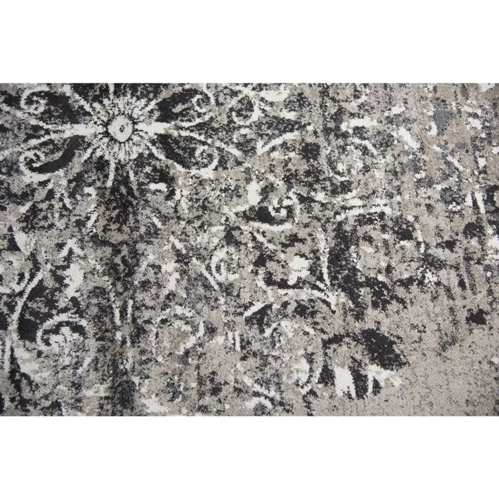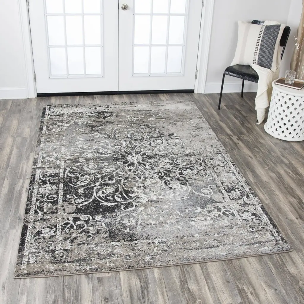 This Alora Décor Swagger Collection transitional area rug features a harmonious neutral palette of taupe, brown, gray, ivory, black and beige to complement a variety of interior design styles. The central medallion scroll work in a distressed design adds a warm rustic element, making it a cozy addition to any room or personal space.