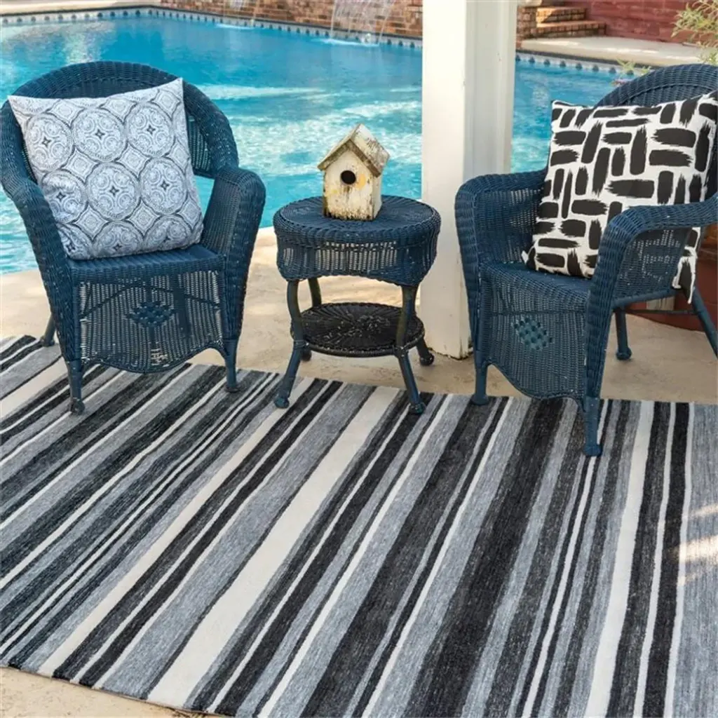 The Bermuda collection is constructed with a full loop pile made of water resistant "œRecycled Polyester"? to be environmentally friendly. Classic, wide awning stripe designs, come to life with on trend, space dyed colors for added dimension and style. Incorporating a water resistant, Polyester backing material, allows for easy water clean-up, making these rugs perfect for the use in "œSemi outdoor"? locations that may be exposed to the elements.Features: • Finish: Gray • Composition: Recycled Polyester • Recycled Polyester • Easy to clean • Water resistant • Backing Materials: PolyesterSpecifications: • Product Dimensions: 8''6"x11''6" ; (Pile Height) 0.5 • Product Weight: 47 lbs.