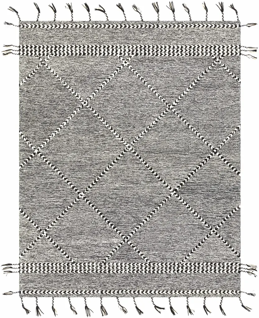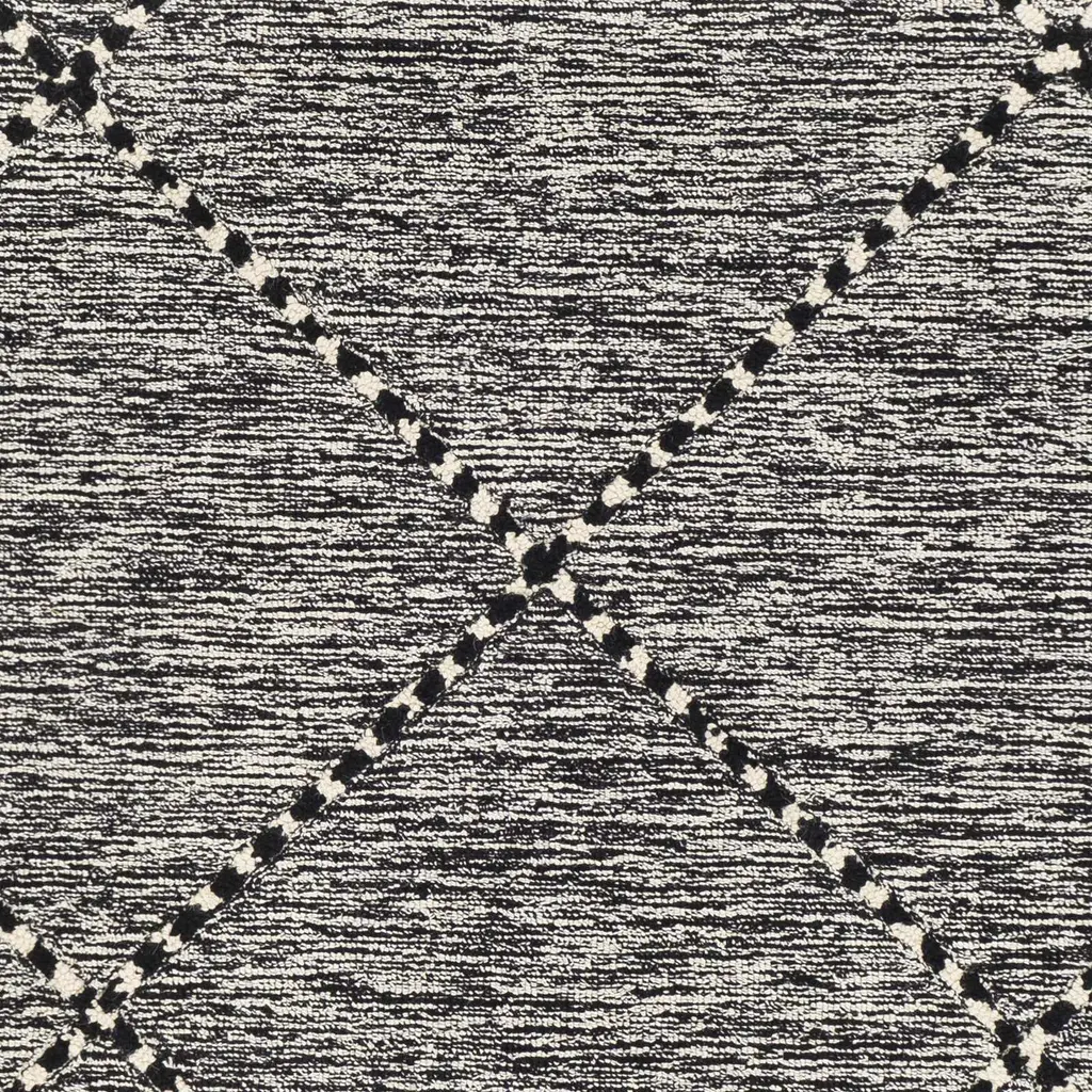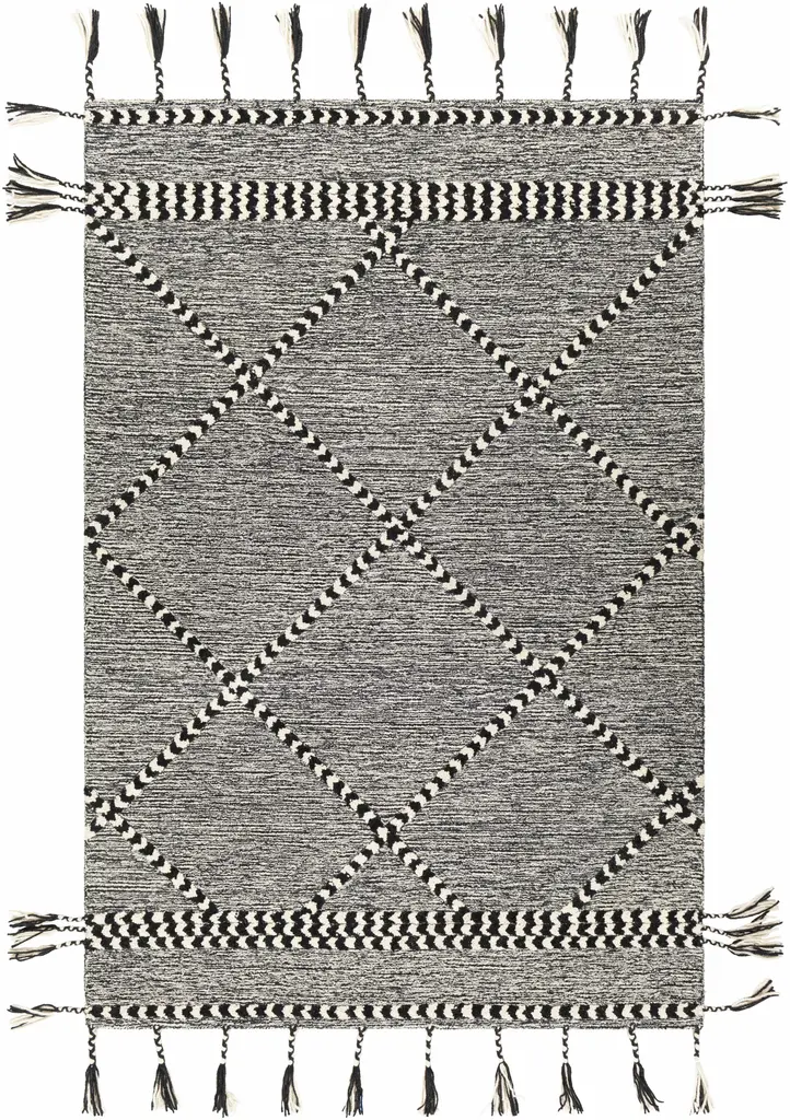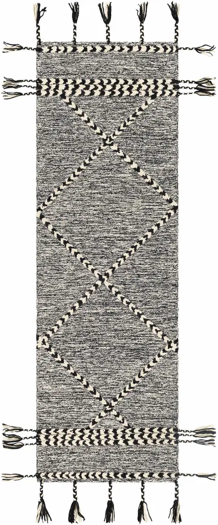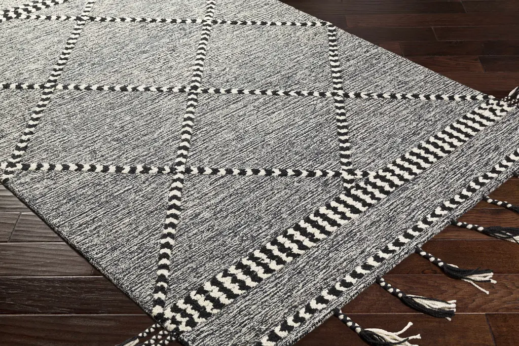 Collection: Alresford Colors: Black, Cream Construction: Hand Tufted Material: 100% Wool Pile: Low Pile Pile Height: 0.2" Styles: Transitional,Bohemian Backing: Canvas Made In: India Thickness: 0.35" Fringe Length: 8.5" Price Range: $$$$$ (Affordable)