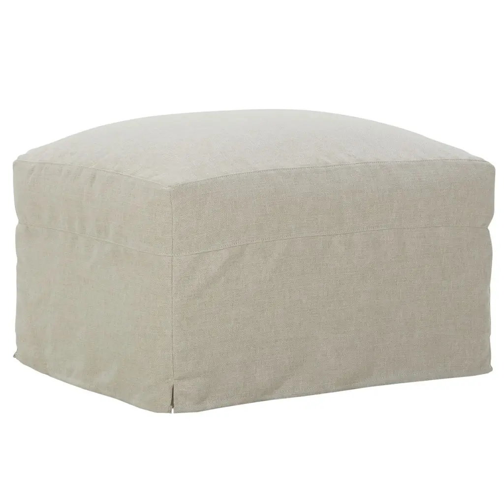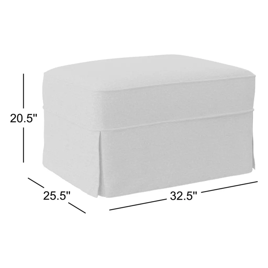 This upholstered ottoman is a versatile addition to your living space, offering a cozy spot to sit, rest your feet, or serve up some tasty treats. Handcrafted in the USA, it features a solid and engineered wood frame with a down-blend cushion atop web suspension for ultimate relaxation. The fitted skirt adds a tailored touch, while the removable cushion cover ensures easy upkeep. Place it in front of your favorite settee and add a braided jute rug for a warm, textured look. Just grab a screwdriver for a quick assembly and you're all set!