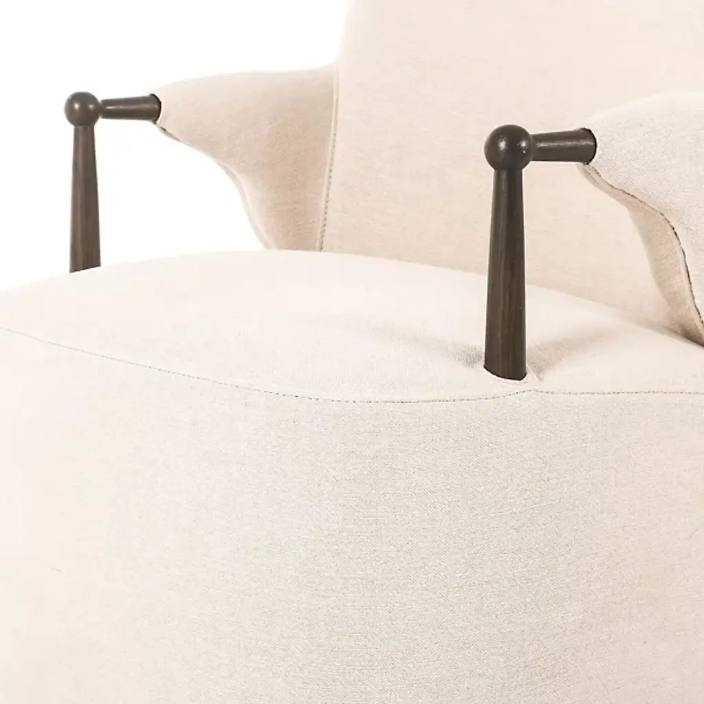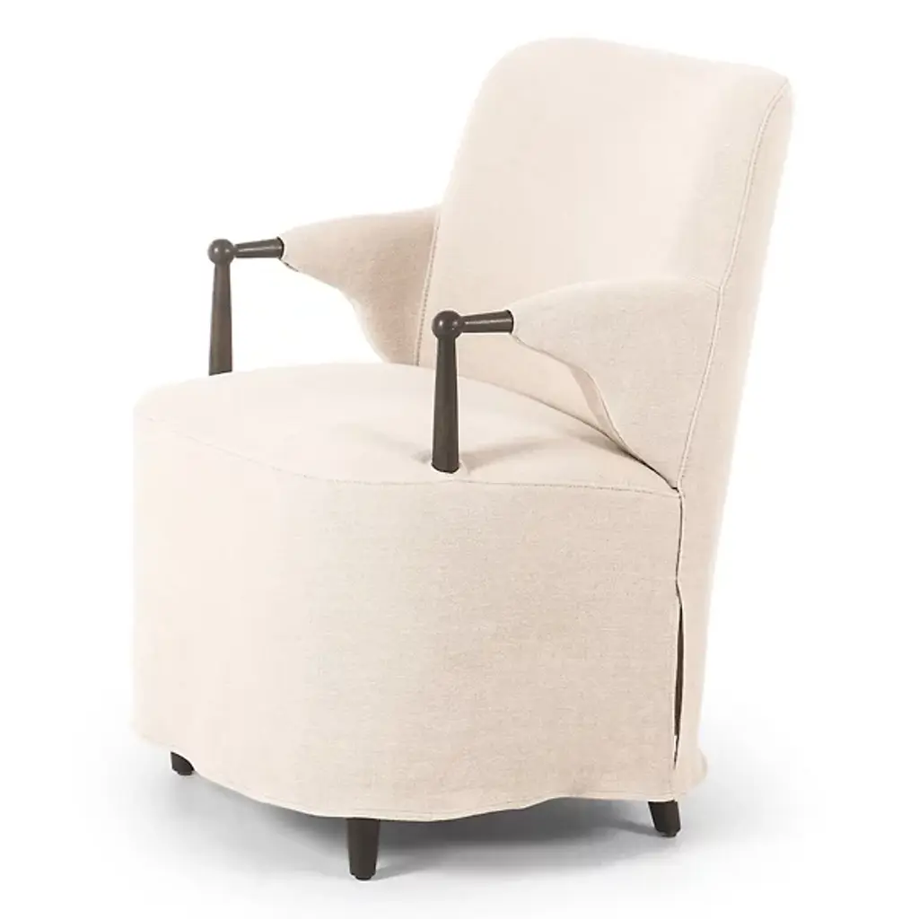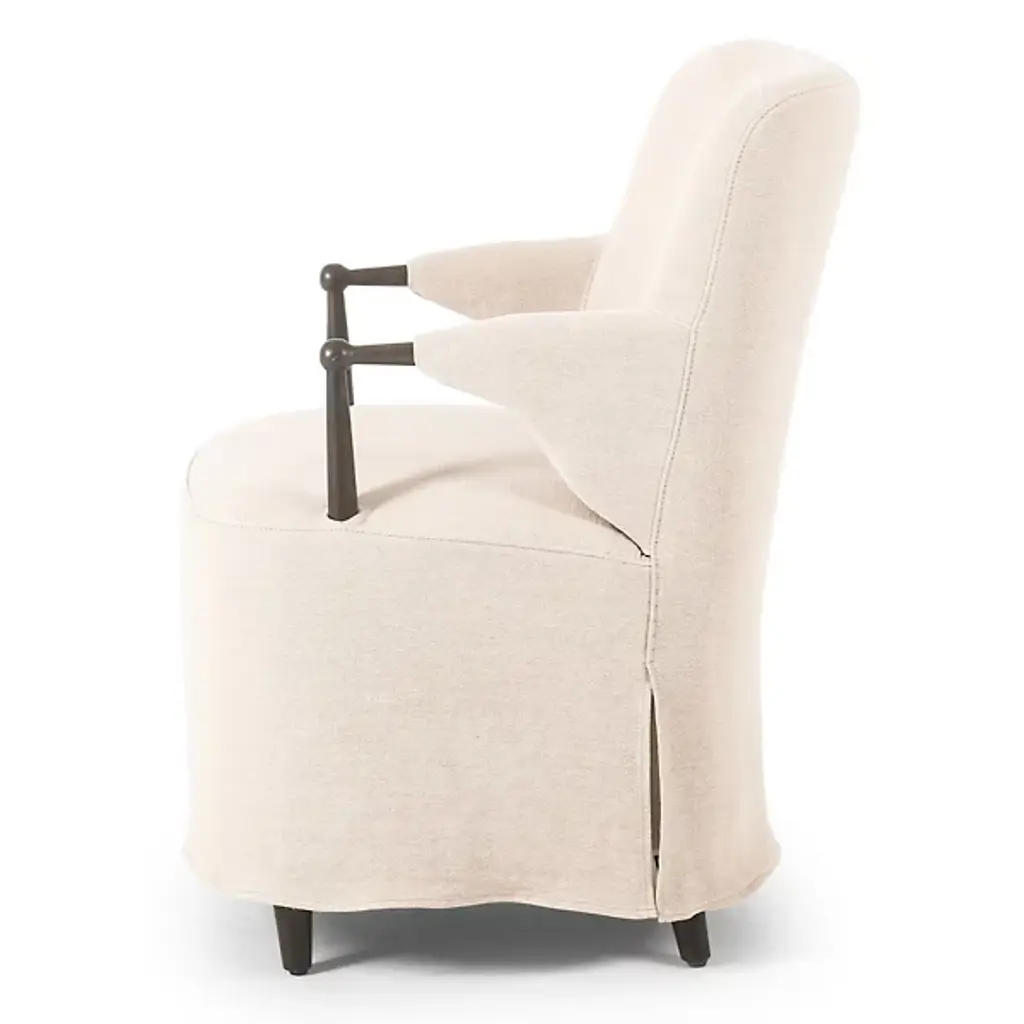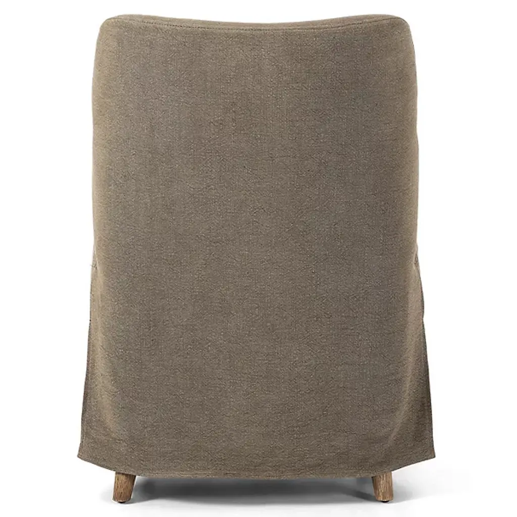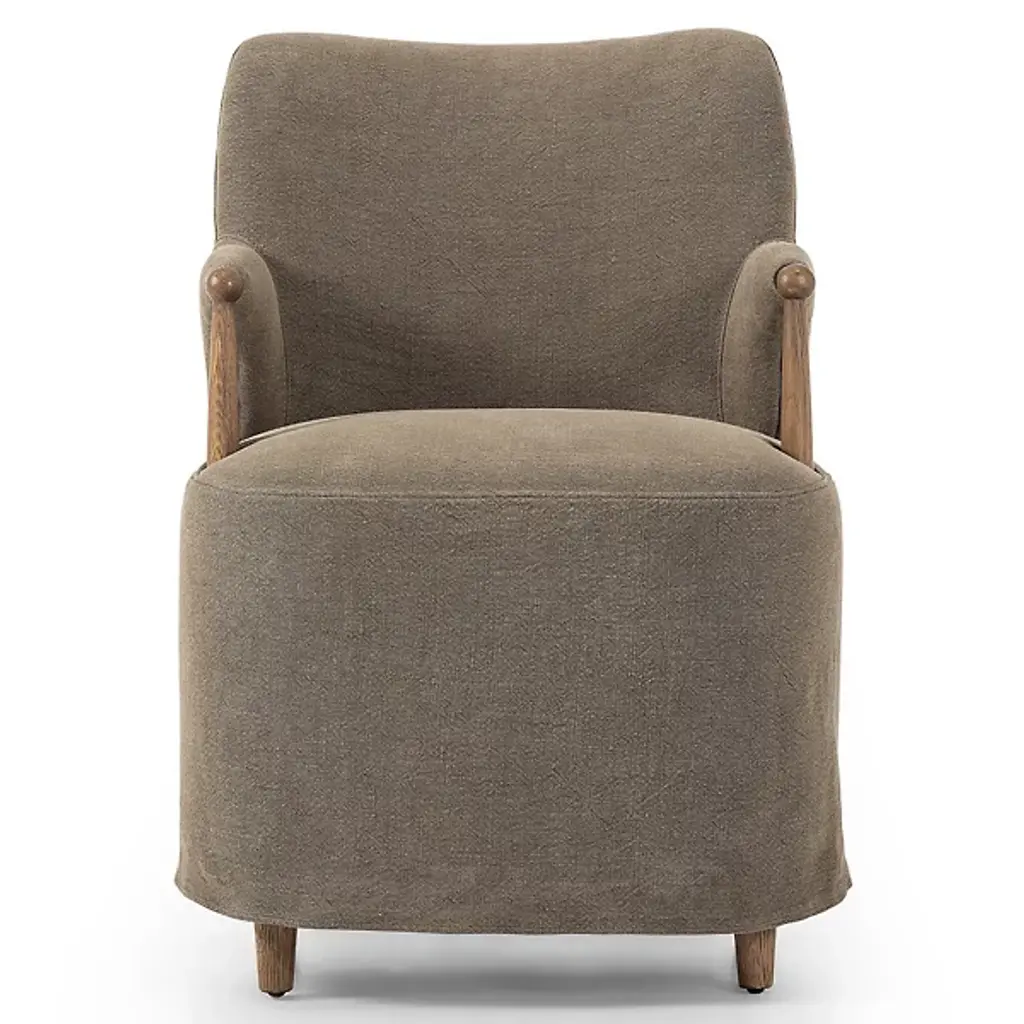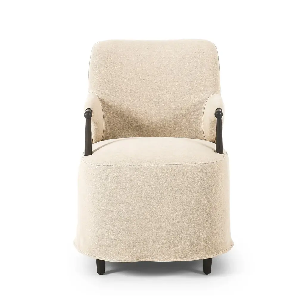 The Amber Lewis x Four Hands Brently Dining Armchair from Four Hands lets you enjoy your meals in contemporary style. It is composed of solid oak, bringing natural warmth to your space. The globe-shaped embellishments at the ends of the chair’s arms add refinement and hold your attention. Your dining armchair is filled with foam for maximum comfort. Brently comprises a combination of flax/linen and polyester for sophistication. Its discreet legs add balance and allow your chair to be placed on area rugs easily.