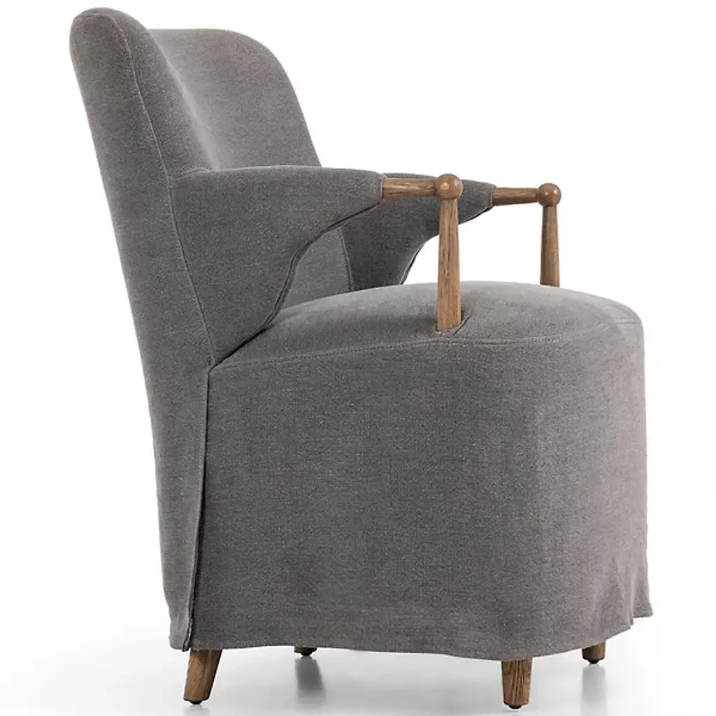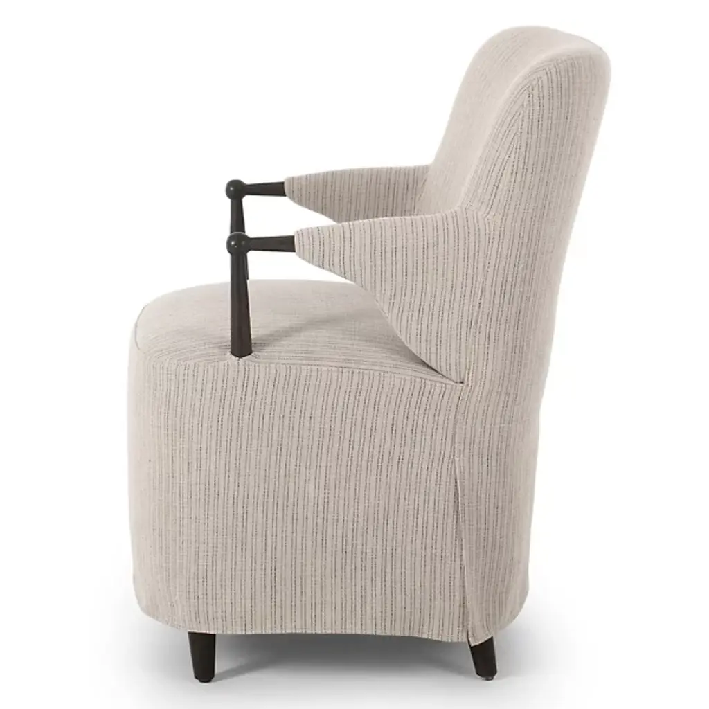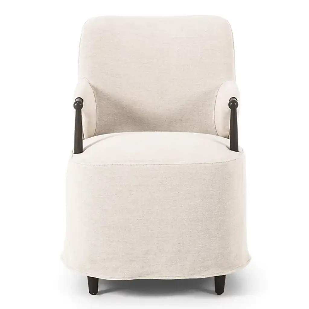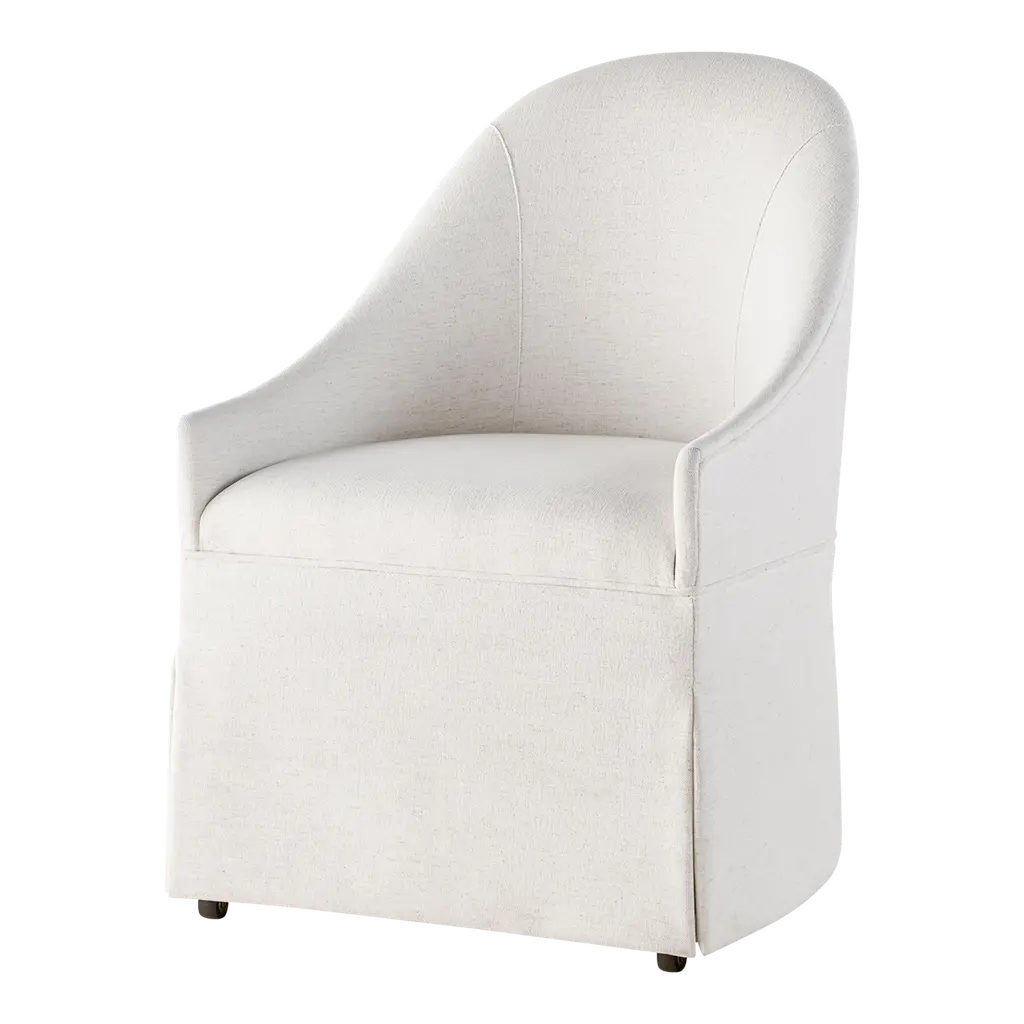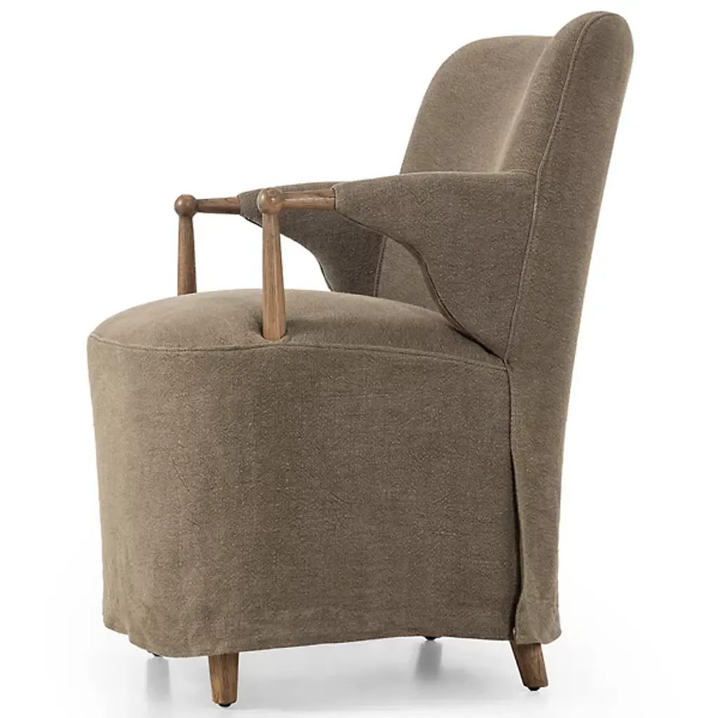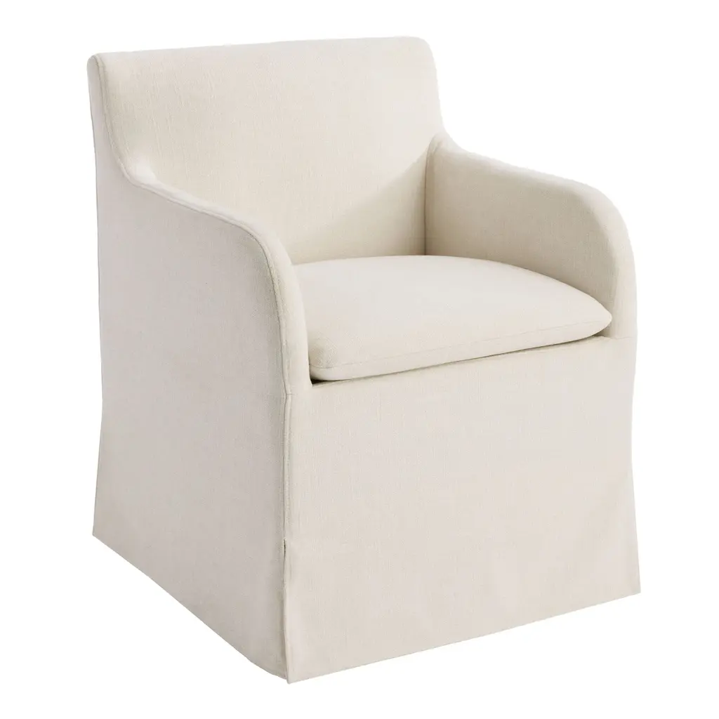 The Amber Lewis x Four Hands Brently Dining Armchair from Four Hands lets you enjoy your meals in contemporary style. It is composed of solid oak, bringing natural warmth to your space. The globe-shaped embellishments at the ends of the chair’s arms add refinement and hold your attention. Your dining armchair is filled with foam for maximum comfort. Brently comprises a combination of flax/linen and polyester for sophistication. Its discreet legs add balance and allow your chair to be placed on area rugs easily.