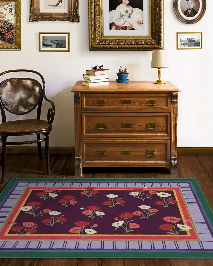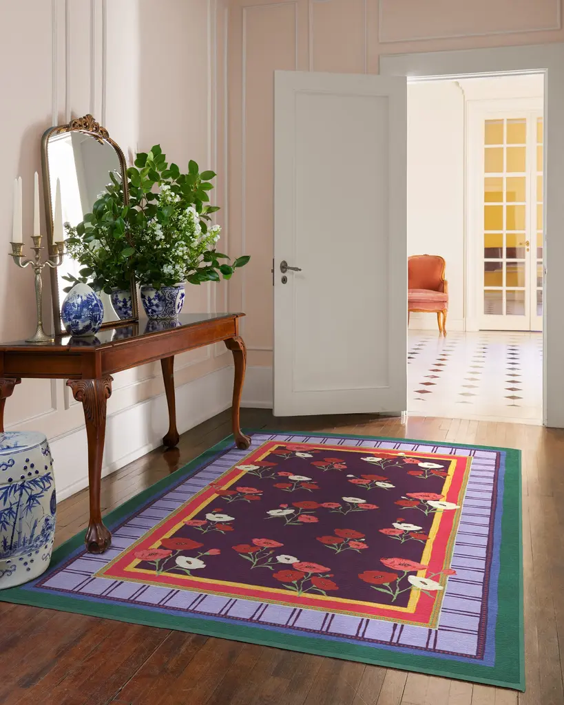 BACK BY POPULAR DEMAND: Step into a garden of creativity with our Limited Edition Iris Apfel Ambroeus Royal Plum Rug. Inspired by Iris' collection of vintage textiles and heirloom, hand-painted scarves, this blooming design features delicate floral motifs with ladybugs hidden among the petals. An intricate border with varied line widths complements the crimson, pink, and white poppies that stretch beautifully against a royal plum background. Bright marigold yellow, pink, light purple, and deep blue-green blend in the lively-colored border. Water-resistant, stain-resistant, and machine-washable. Rug colors may vary slightly according to your device and the lighting in your space.