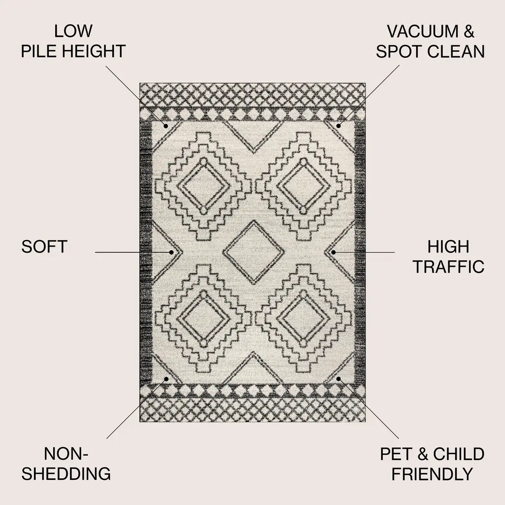 Moroccan influences abound in the geometric design of this rug. Shades charcoal black create a lively medallion design against a deep cream background. Add graphic impact to a modern room, or make this rug part of your Boho-chic story.