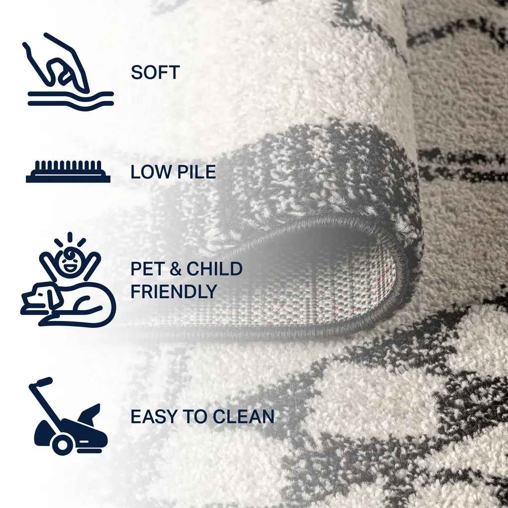 Moroccan influences abound in the geometric design of this rug. Shades charcoal black create a lively medallion design against a deep cream background. Add graphic impact to a modern room, or make this rug part of your Boho-chic story.