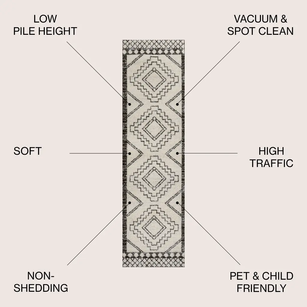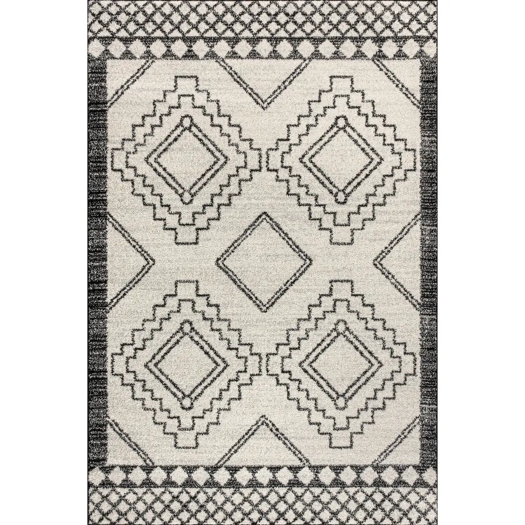 Moroccan influences abound in the geometric design of this rug. Shades charcoal black create a lively medallion design against a deep cream background. Add graphic impact to a modern room, or make this rug part of your Boho-chic story.