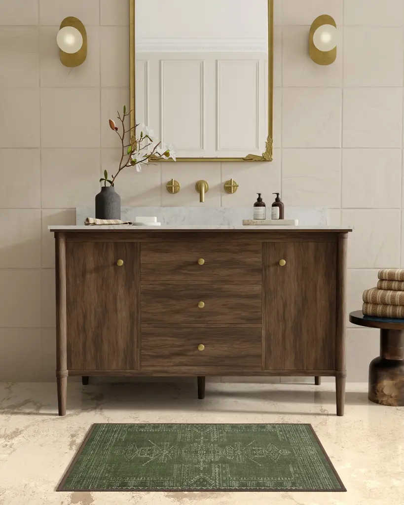Our Martyn Lawrence Bullard Amira Green Rug is made for gathering. Inspired by simple geometric forms and traditional woven rug layouts, this symmetrical design combines muted elegance and timeless tradition. Using a distressed overall effect for extra character, the light cream motifs, featuring highs and lows, are beautifully set against a dark green background. Water-resistant, stain-resistant, and machine-washable. Rug colors may vary slightly according to your device and the lighting in your space.