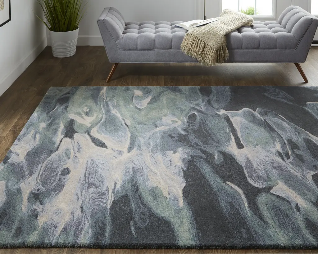 Collection: Amira Colors: Green, Blue, Black Construction: Hand Tufted Material: Face: 100%Wool / Warp: Cotton Pile: Medium Pile Pile Height: 0.51" Styles: Transitional,Industrial,Casual Backing: Cotton Made In: India Thickness: 0.51" Price Range: $$$$$ (Premium)