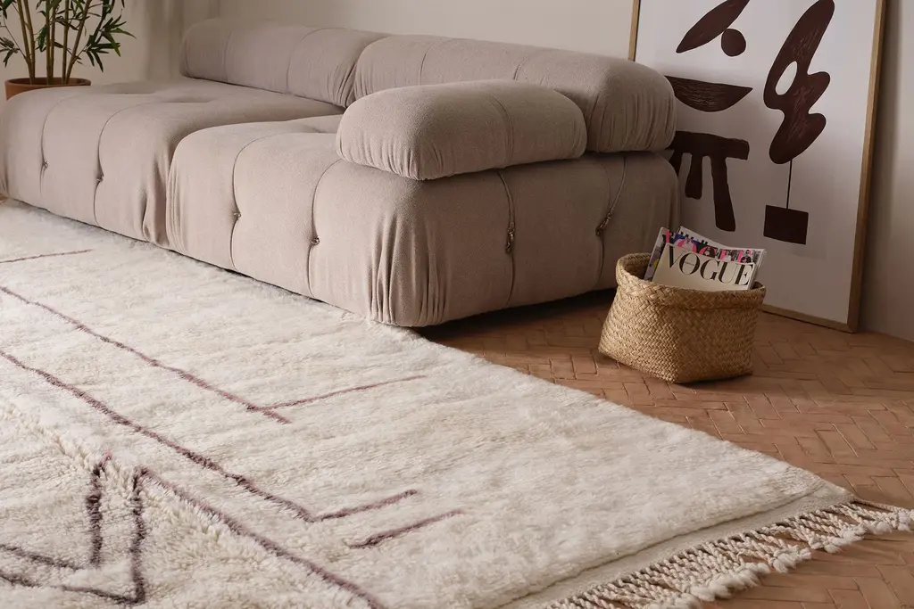 Our Moroccan pieces are each one-of-a-kind. Much of our collection was woven between 30 and 100 years ago, and curated by us. Other rugs in our collection are fresh off the loom and made with traditional techniques. Moroccan rugs don’t come with a key. As with any painting or poem, their motifs have many subjective interpretations. Originally made for personal use, these rugs took months to weave, documenting a shifting tide of events and emotions in the weaver’s life.