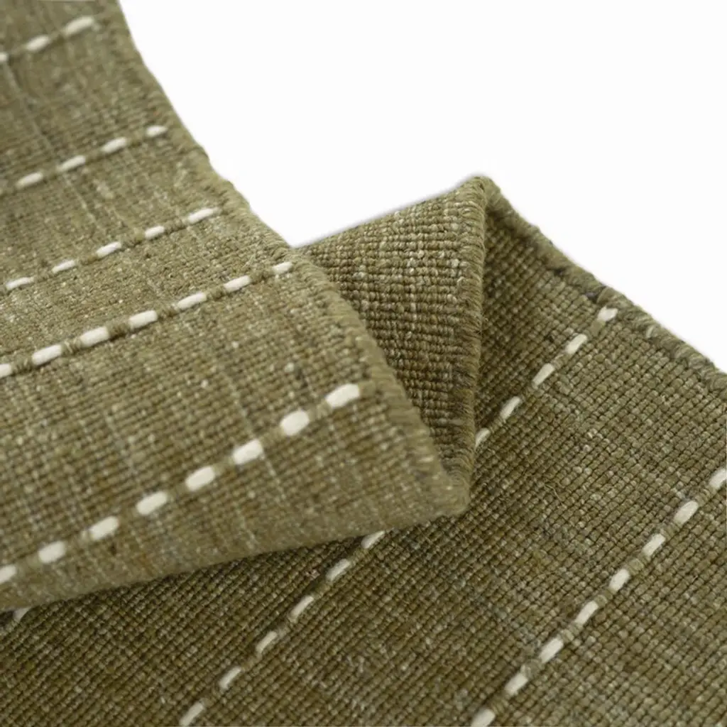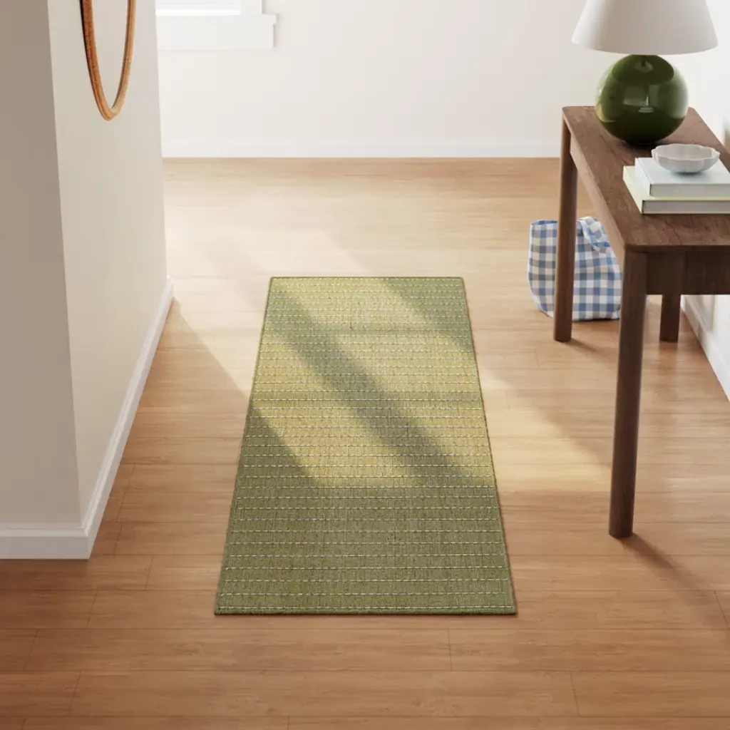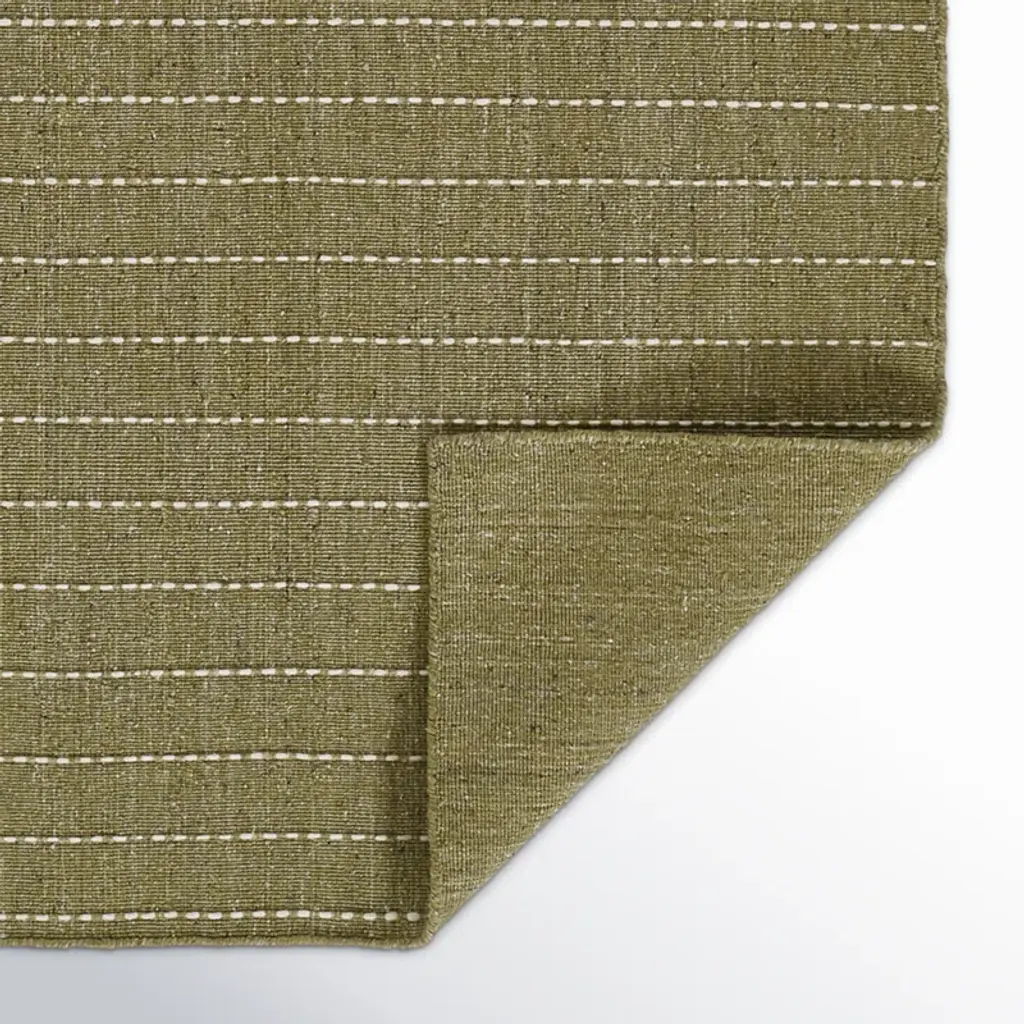 This hand-loomed wool blend rug was created using an abrash technique, which highlights variations in the colors (in this case, green and beige) in a unique and organic way. It is subtle enough to not detract from patterned upholstery or window treatments but can hold its own in a quiet room. Safe for use over heated floors. We suggest rolling it out over a rug pad to keep it from shifting.