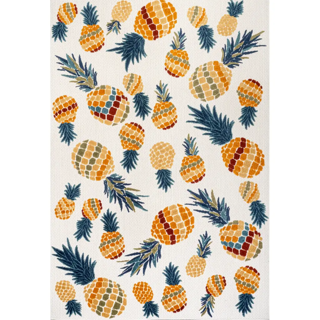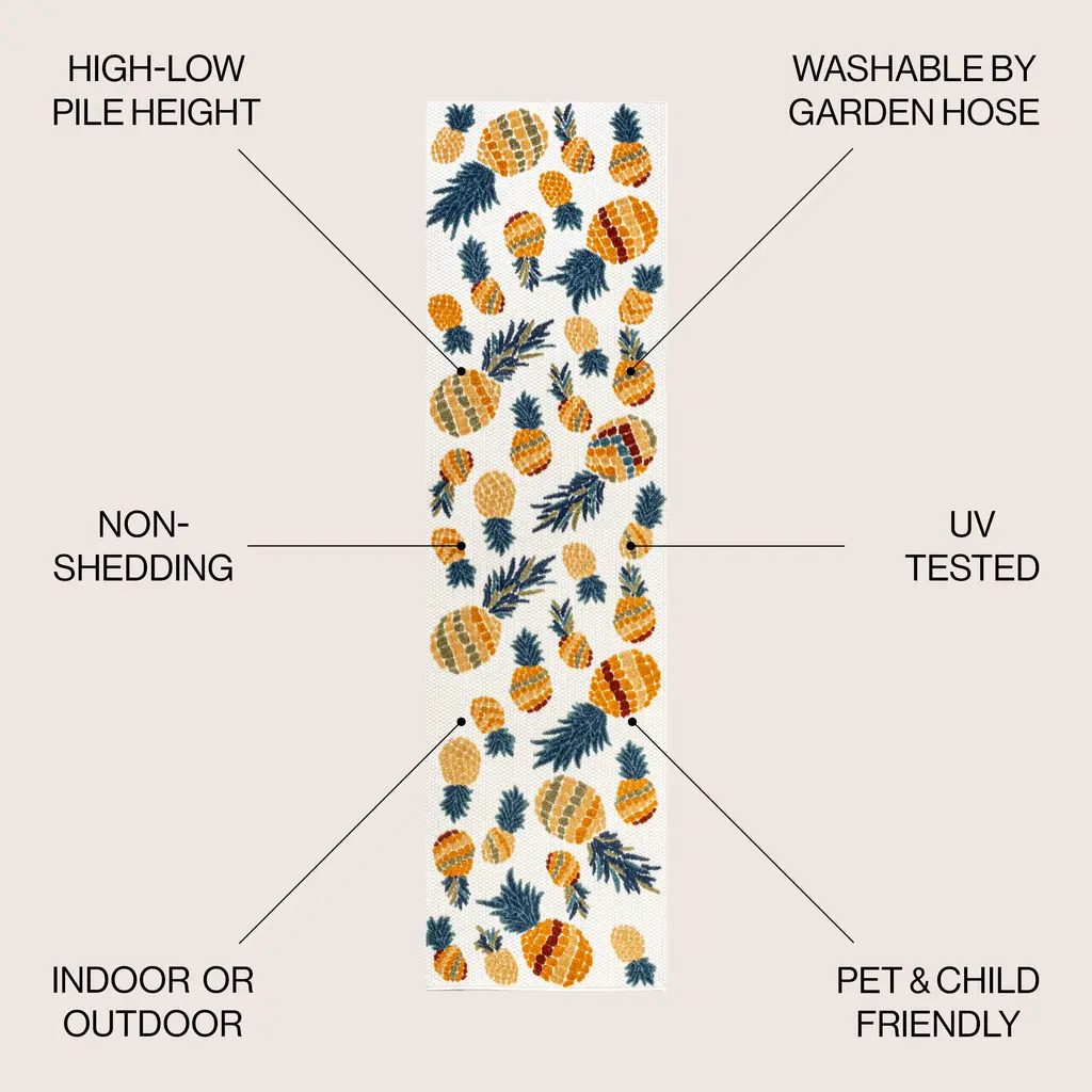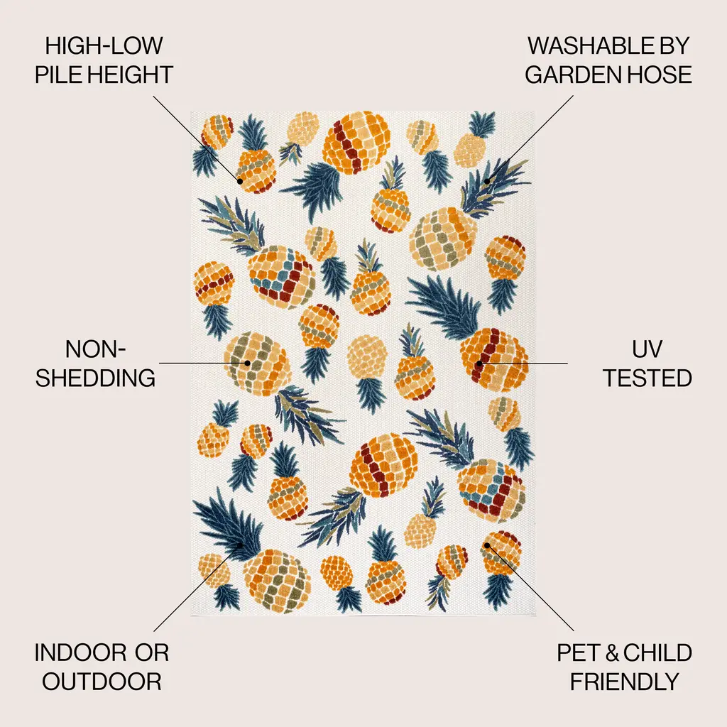 Add a tropical touch with our modern take on a graphic pineapple design. Our graphic rug will add a bold pop of pattern and color to the living room, dining room, bedroom or office. Perfect for the porch, this pet-friendly and low-pile design is easy to clean.